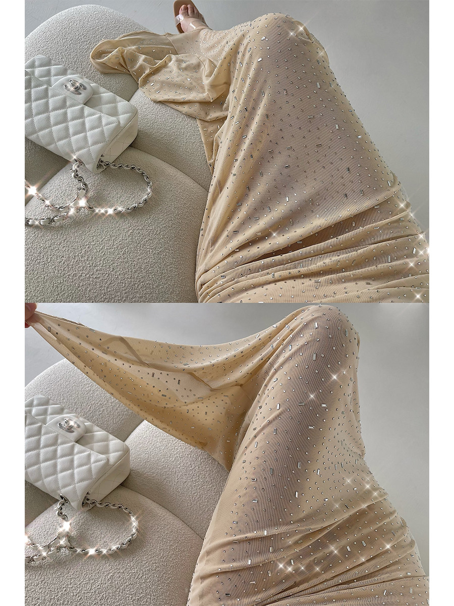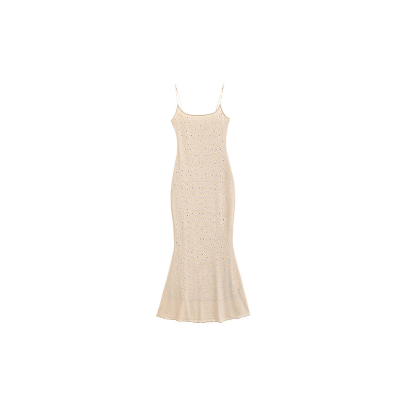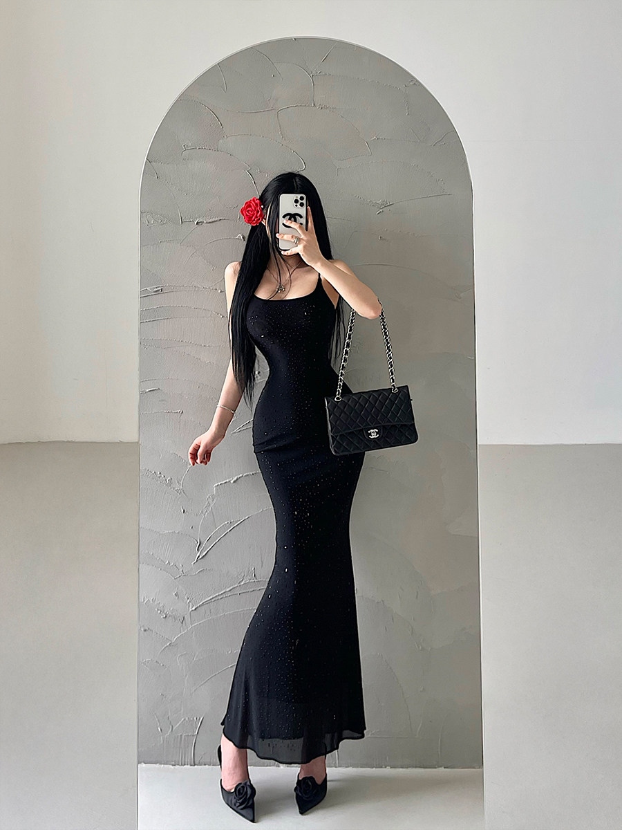 YoungGirlDay重工卡戴珊烫钻度假网纱包臀性感鱼尾吊带连衣裙长裙