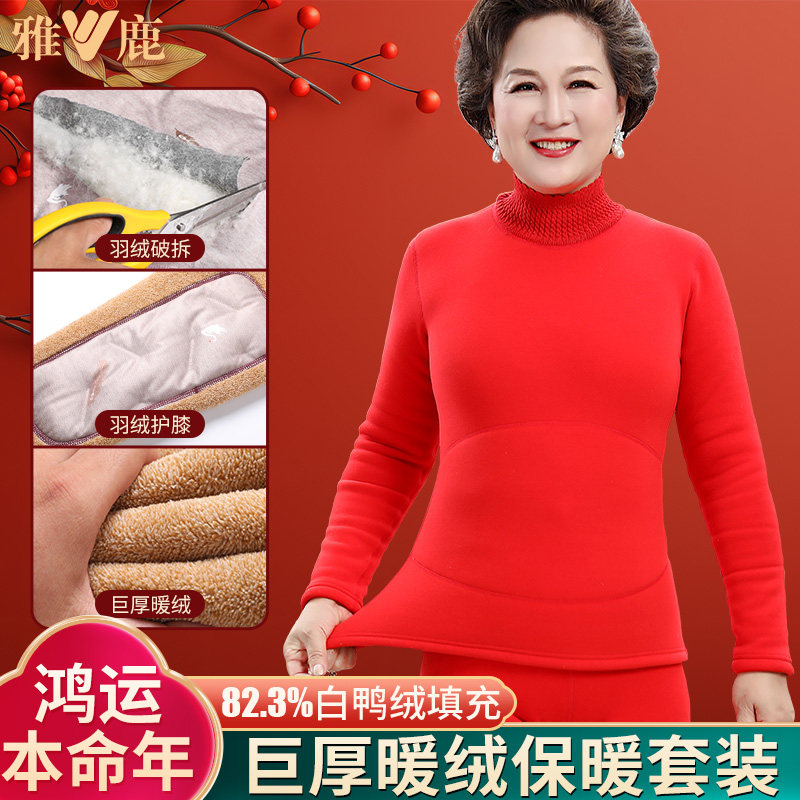 雅鹿中老年加绒加厚高领本命年保暖内衣套装护膝大红色秋衣秋裤女