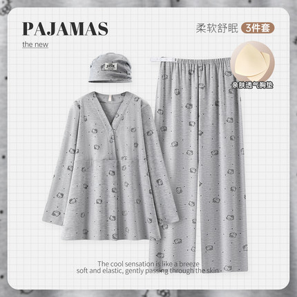带帽子带胸垫纯棉灰色秋冬月子服