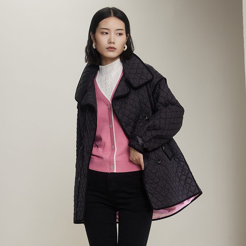 梵凯女棉衣外套2024冬撞色翻领薄款棉衣外套新中式中长款时尚外套