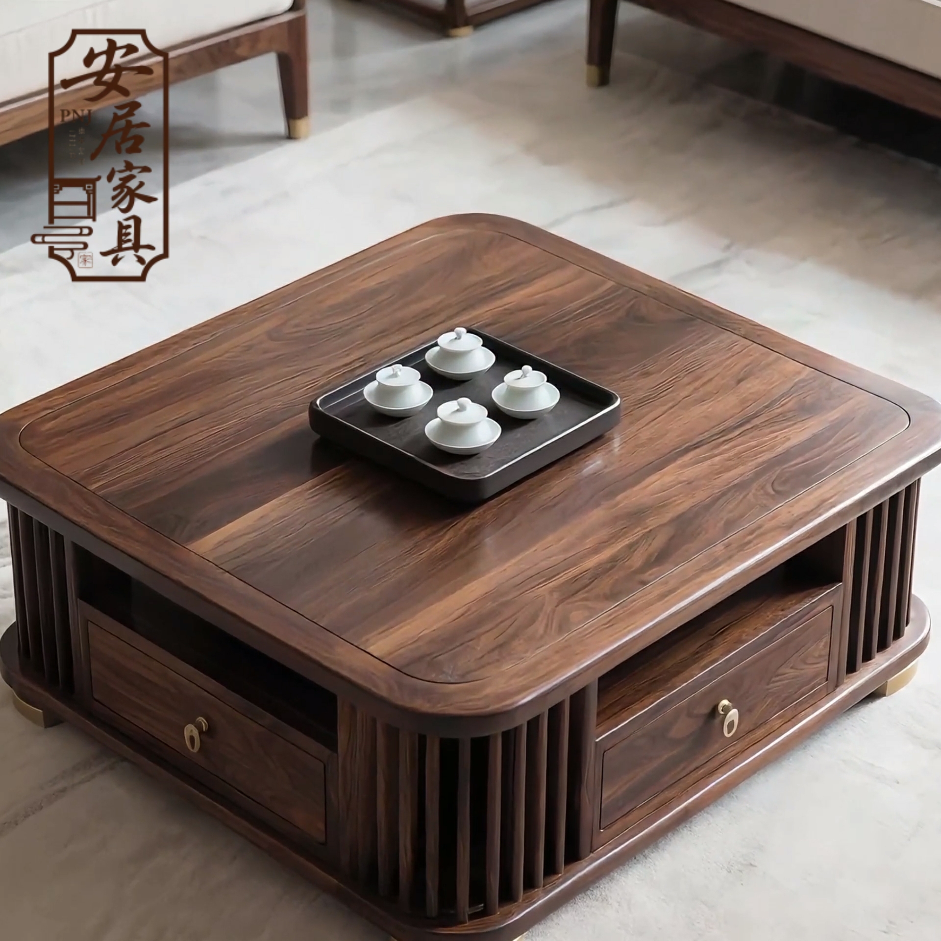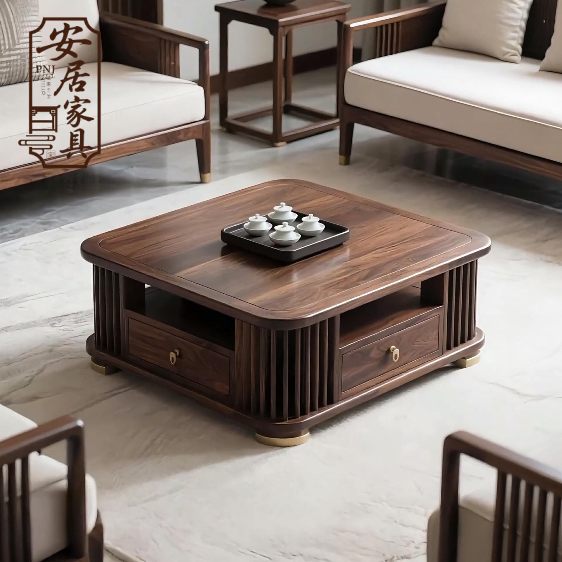 北美黑胡桃木新中式实木正方形茶几轻奢别墅大小户型客厅茶桌定制