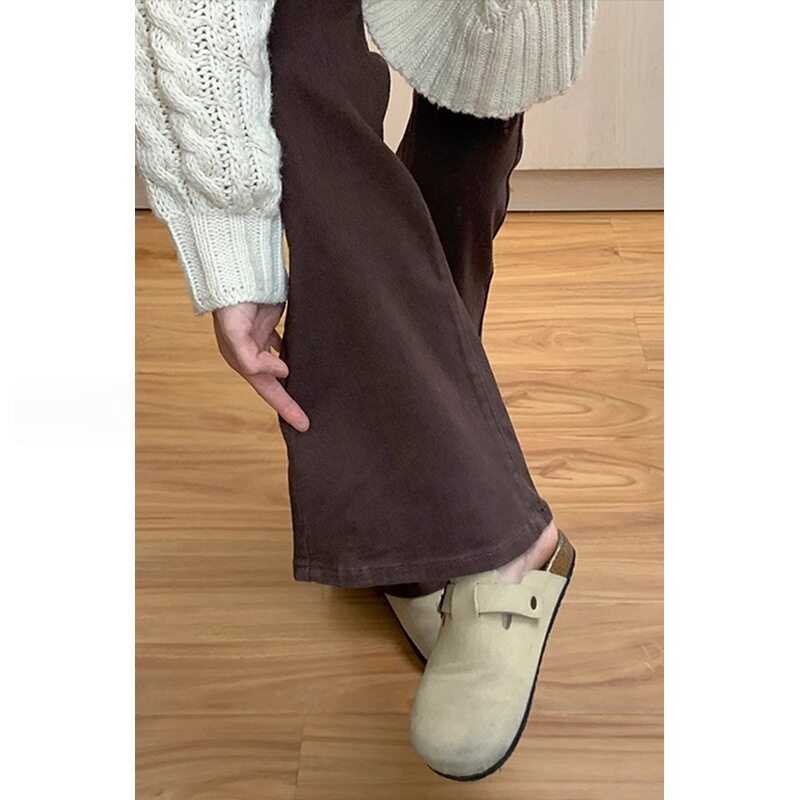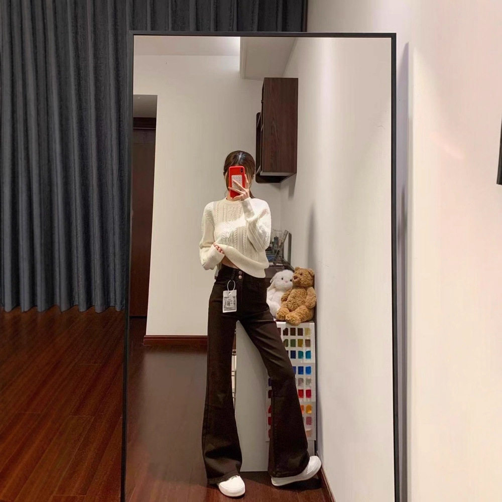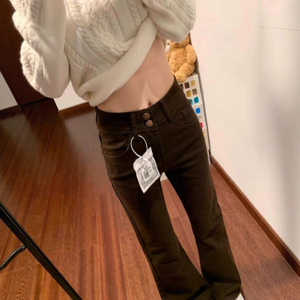 设计感咖啡色微喇牛仔裤女冬加绒加厚大码胖mm弹力修身显瘦喇叭裤