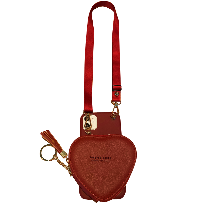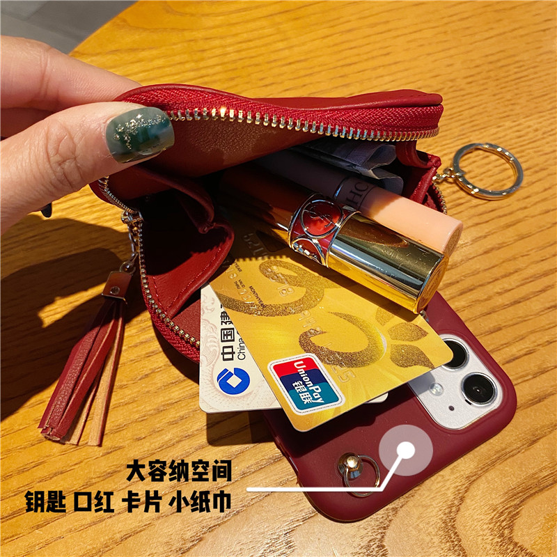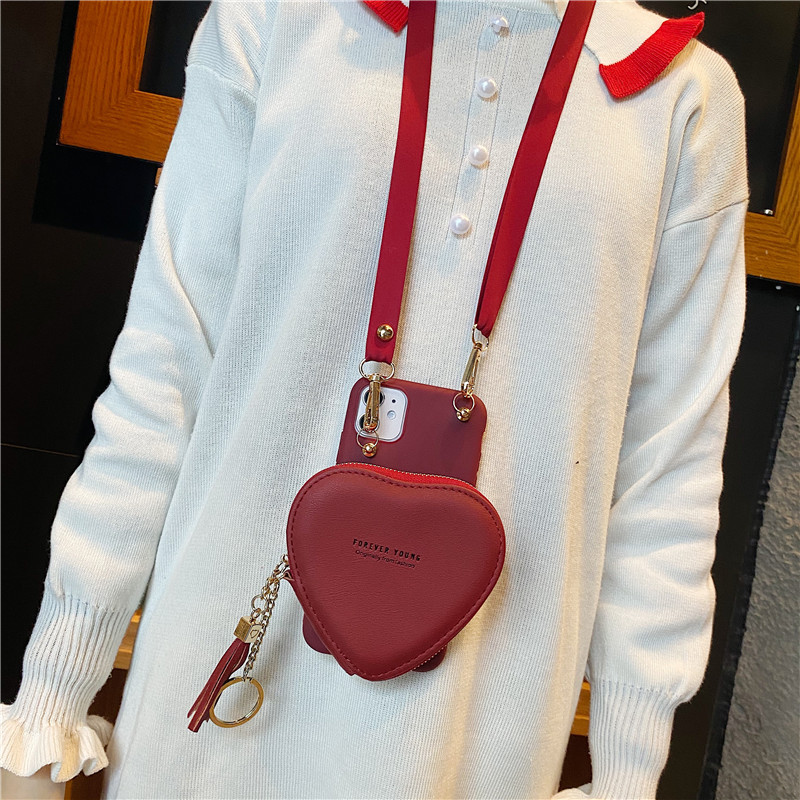 心形零钱包适用苹果12promax手机壳iphone14plus斜挎15酒红11软13女款17带挂绳8车钥匙包xsmax防摔套14卡包16