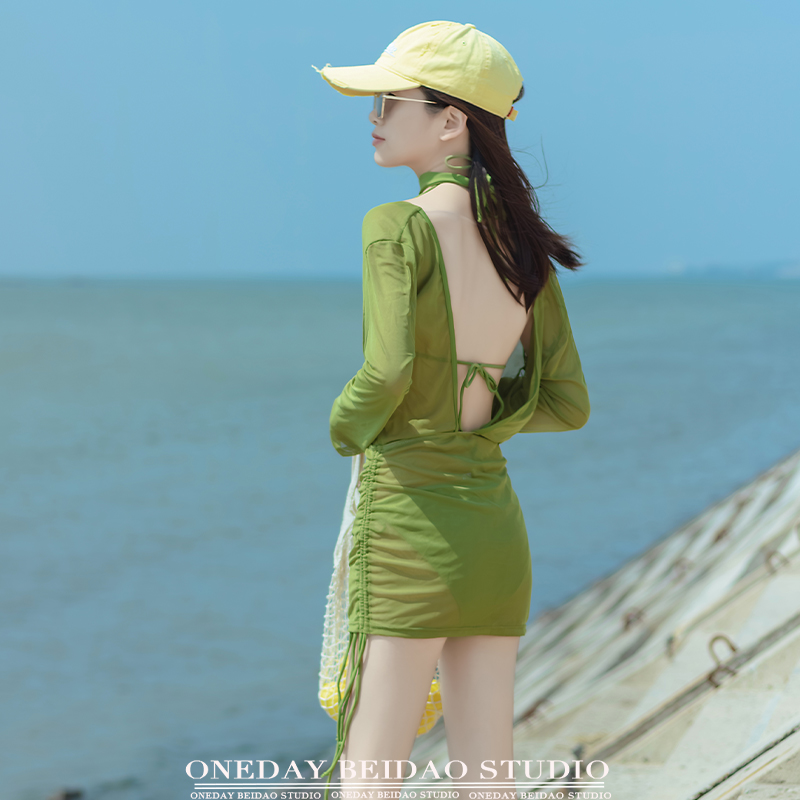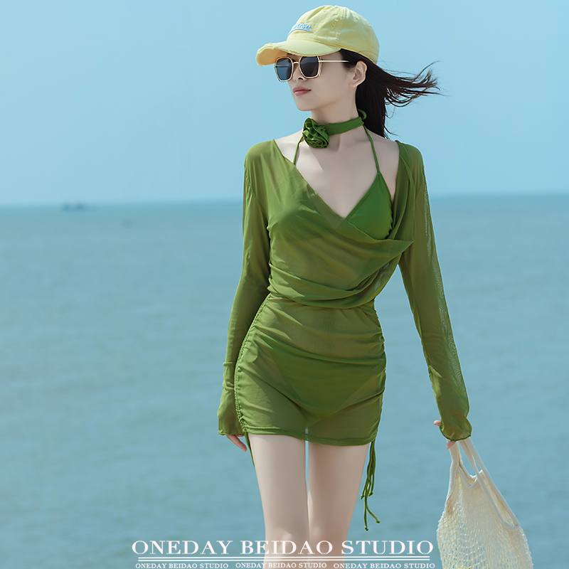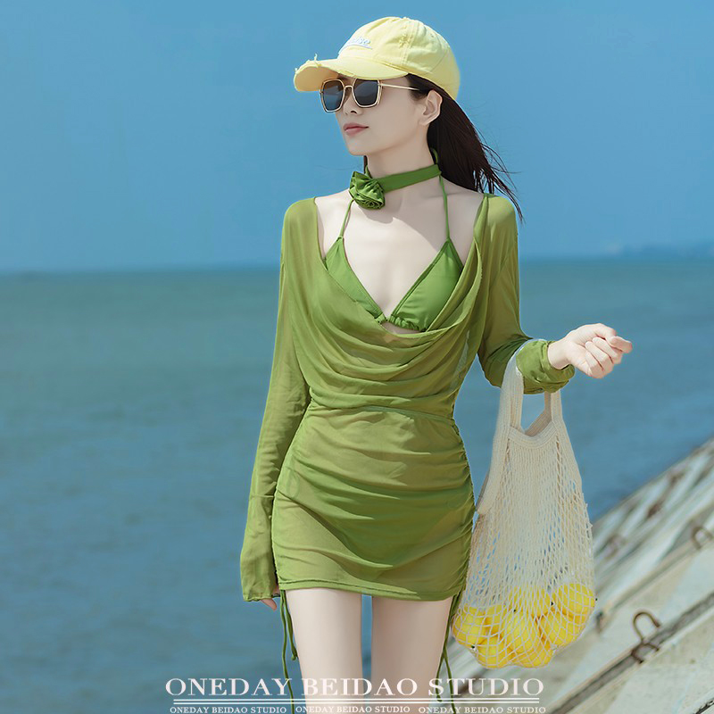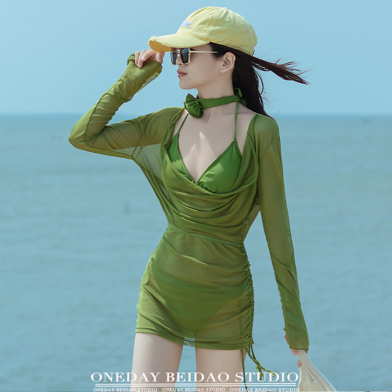 游泳衣女三件套度假性感显瘦泡温泉聚拢分体比基尼绿色显白泳衣