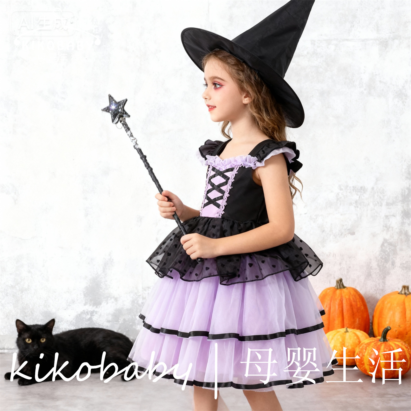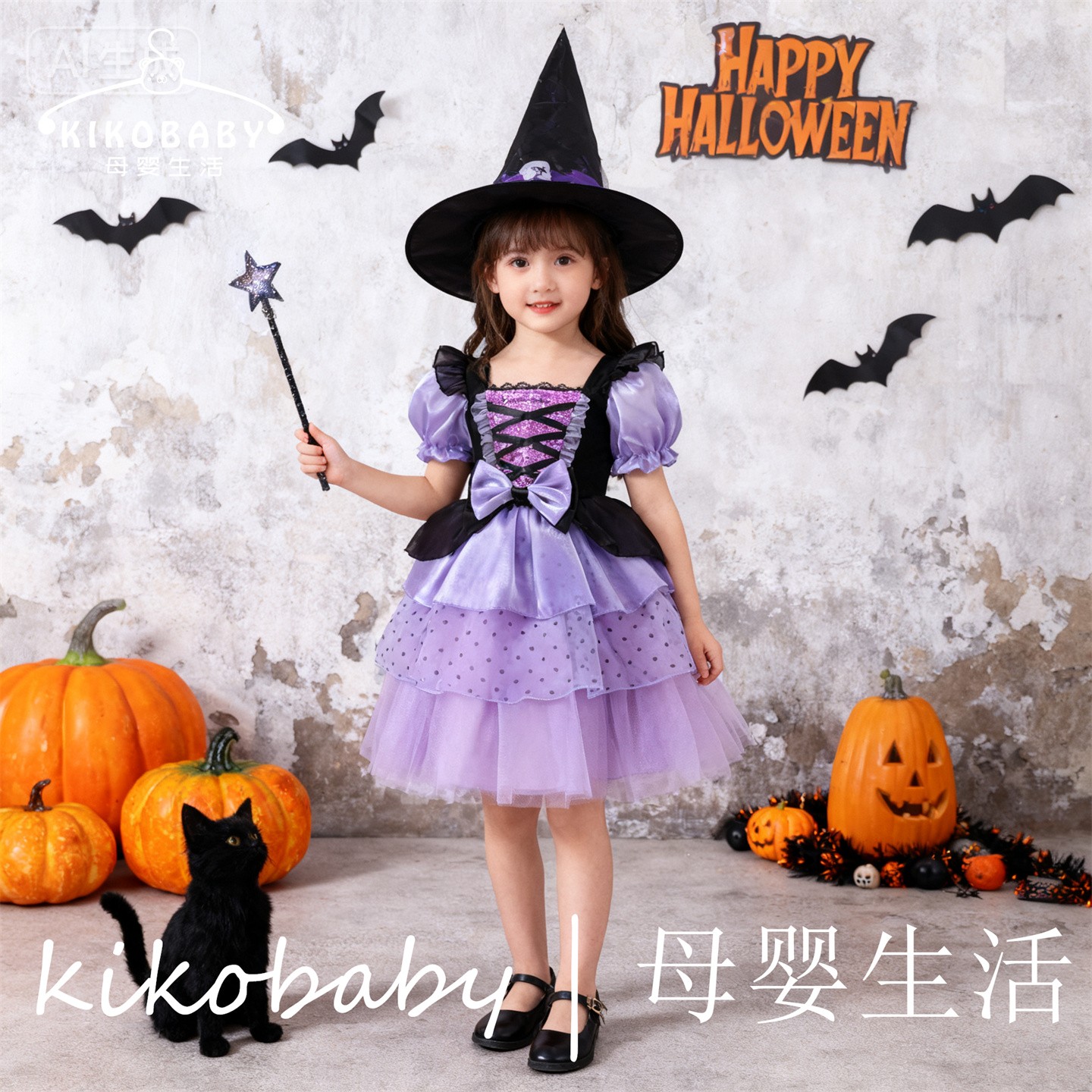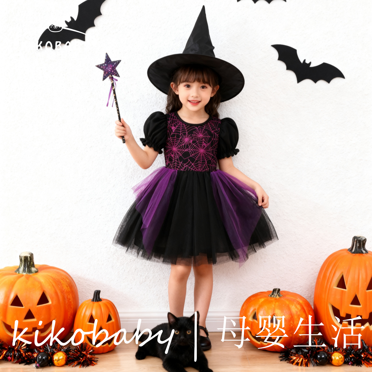 外贸女童万圣节短袖蜘蛛网连衣裙紫色派对风网纱蓬蓬裙HALLOWEEN