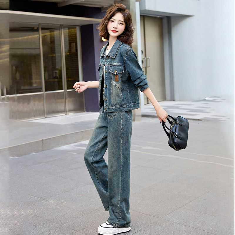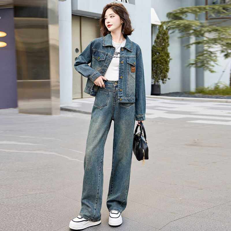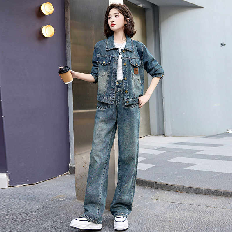 2024春秋新款牛仔套装女港风休闲时尚洋气做旧显瘦减龄复古两件套
