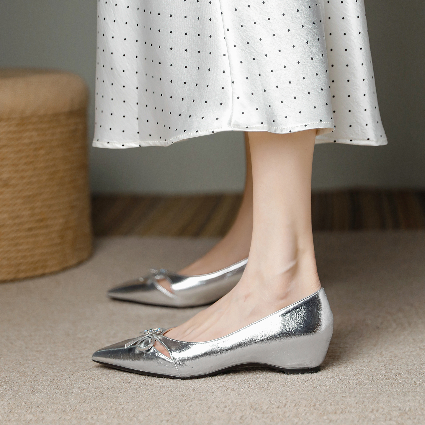 银色羊皮蝴蝶结内增高单鞋女