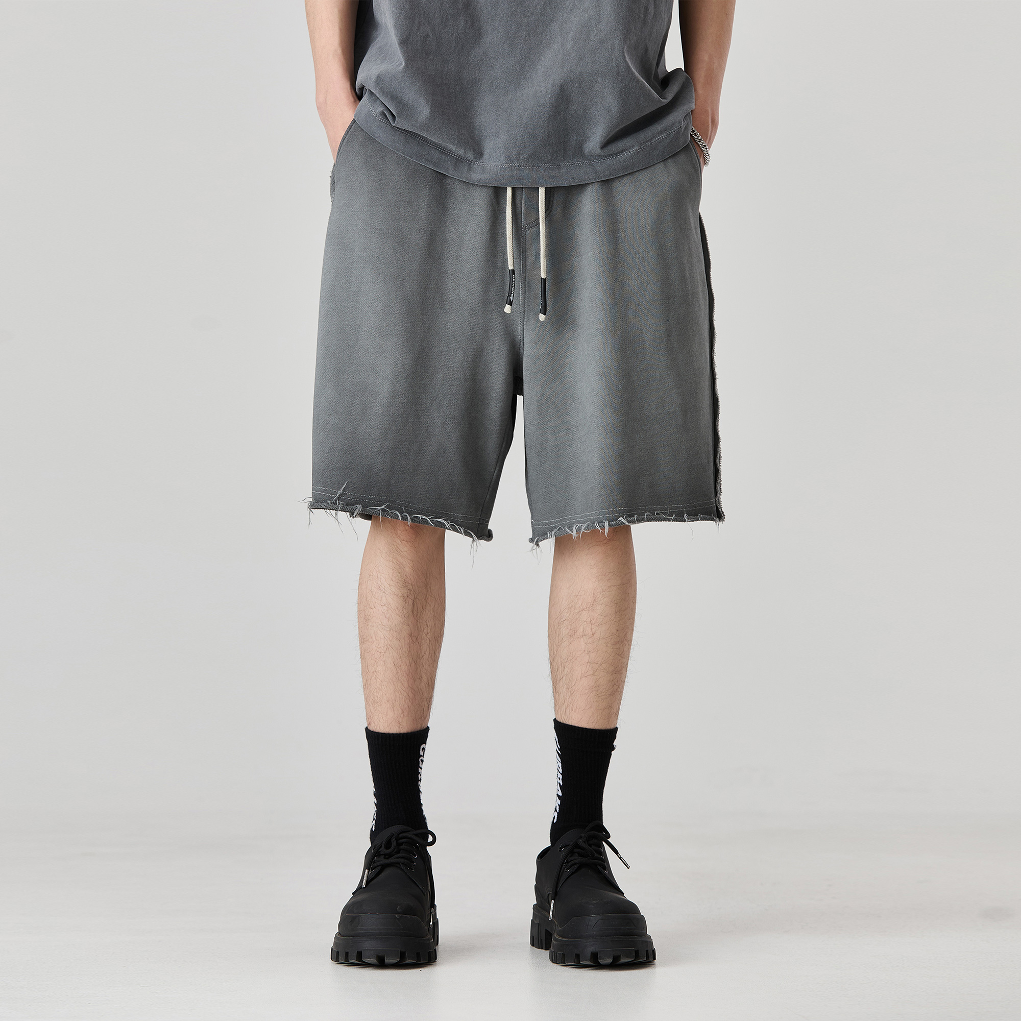 ALLIN 美式休闲短裤男夏季重磅水洗做旧中裤宽松直筒毛边五分裤子