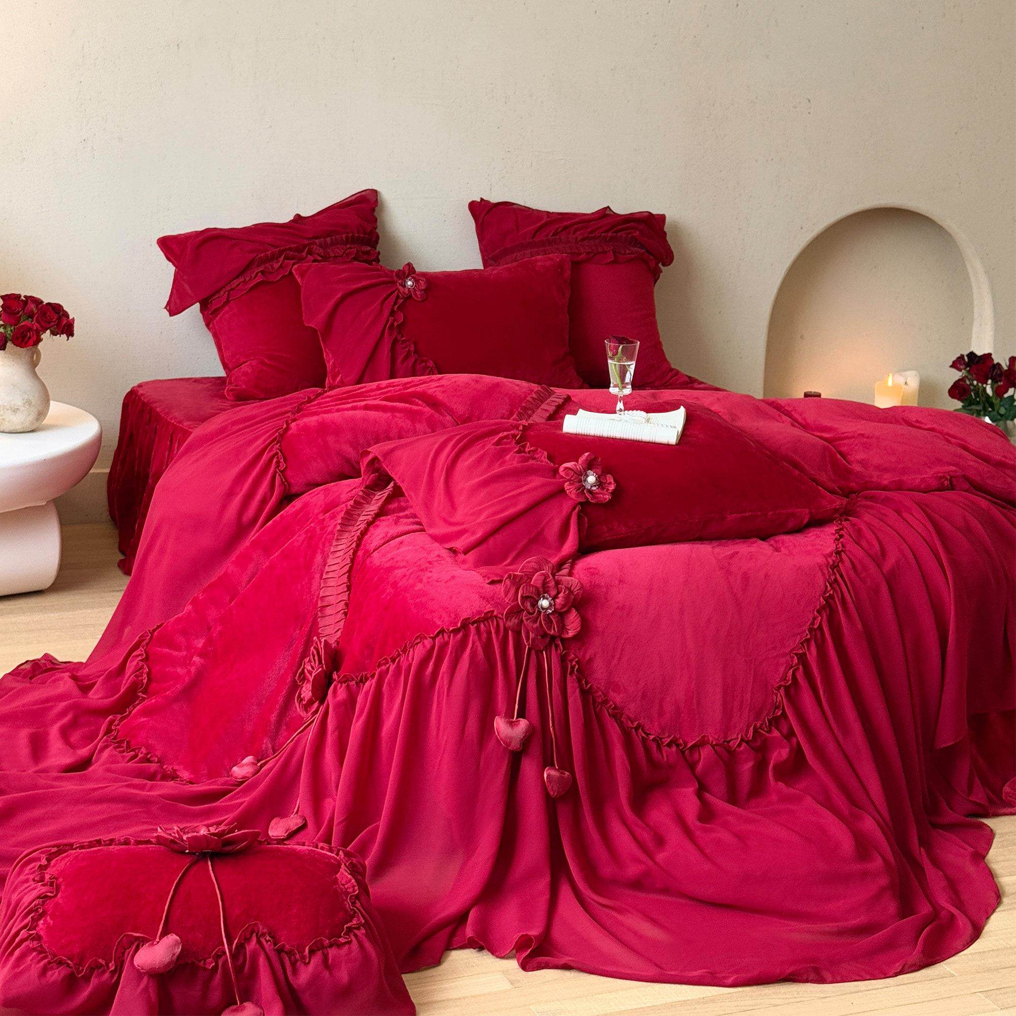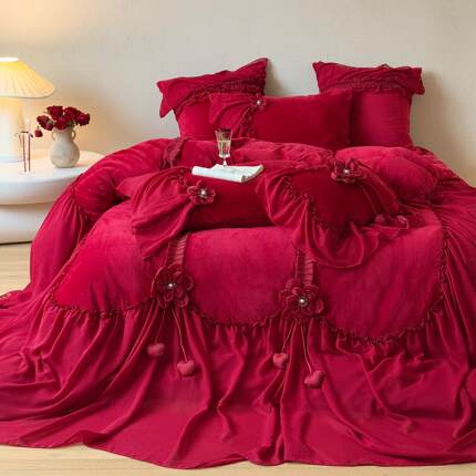 冬天浪漫婚礼牛奶绒四件套立体花朵雪纺花边被套保暖床单婚庆床品