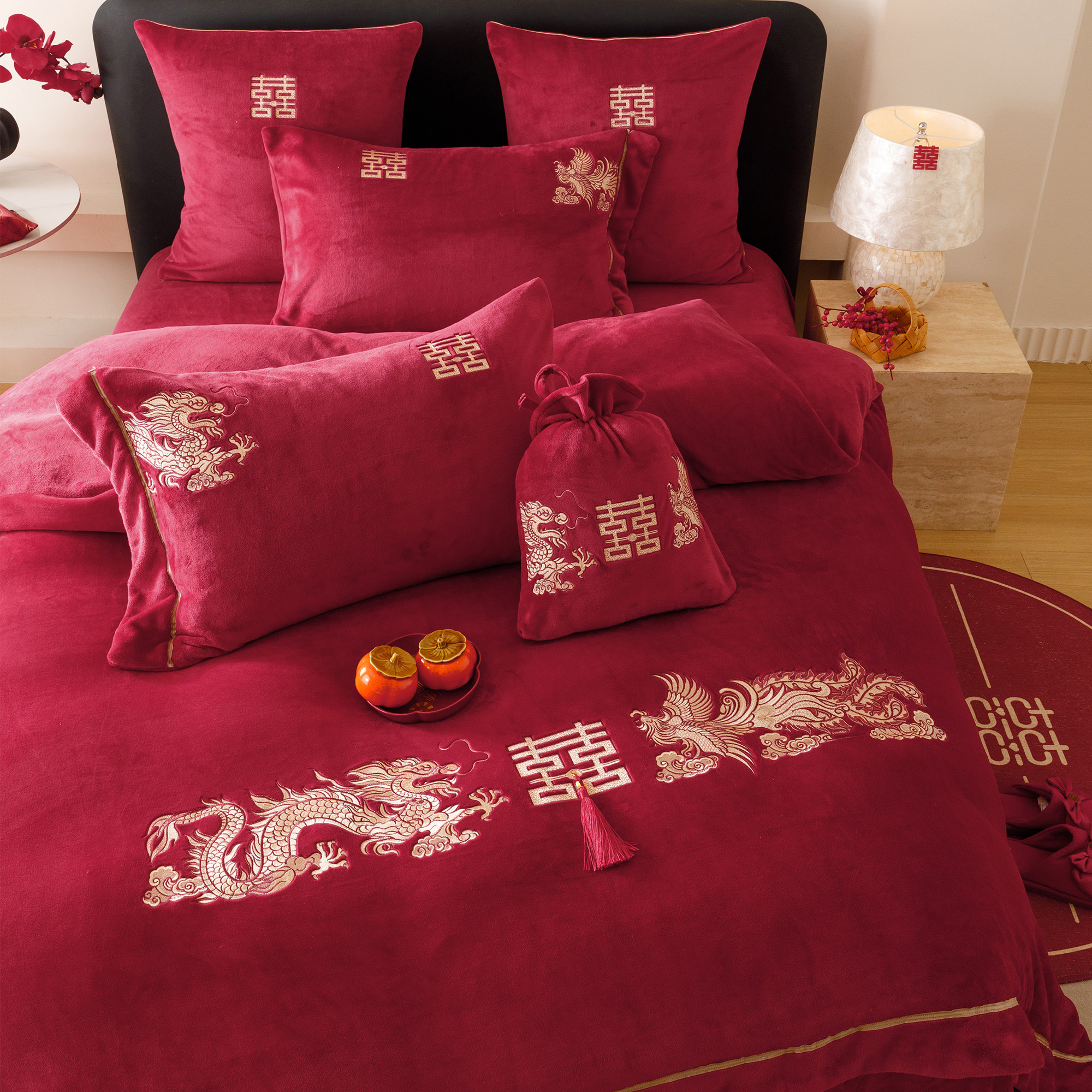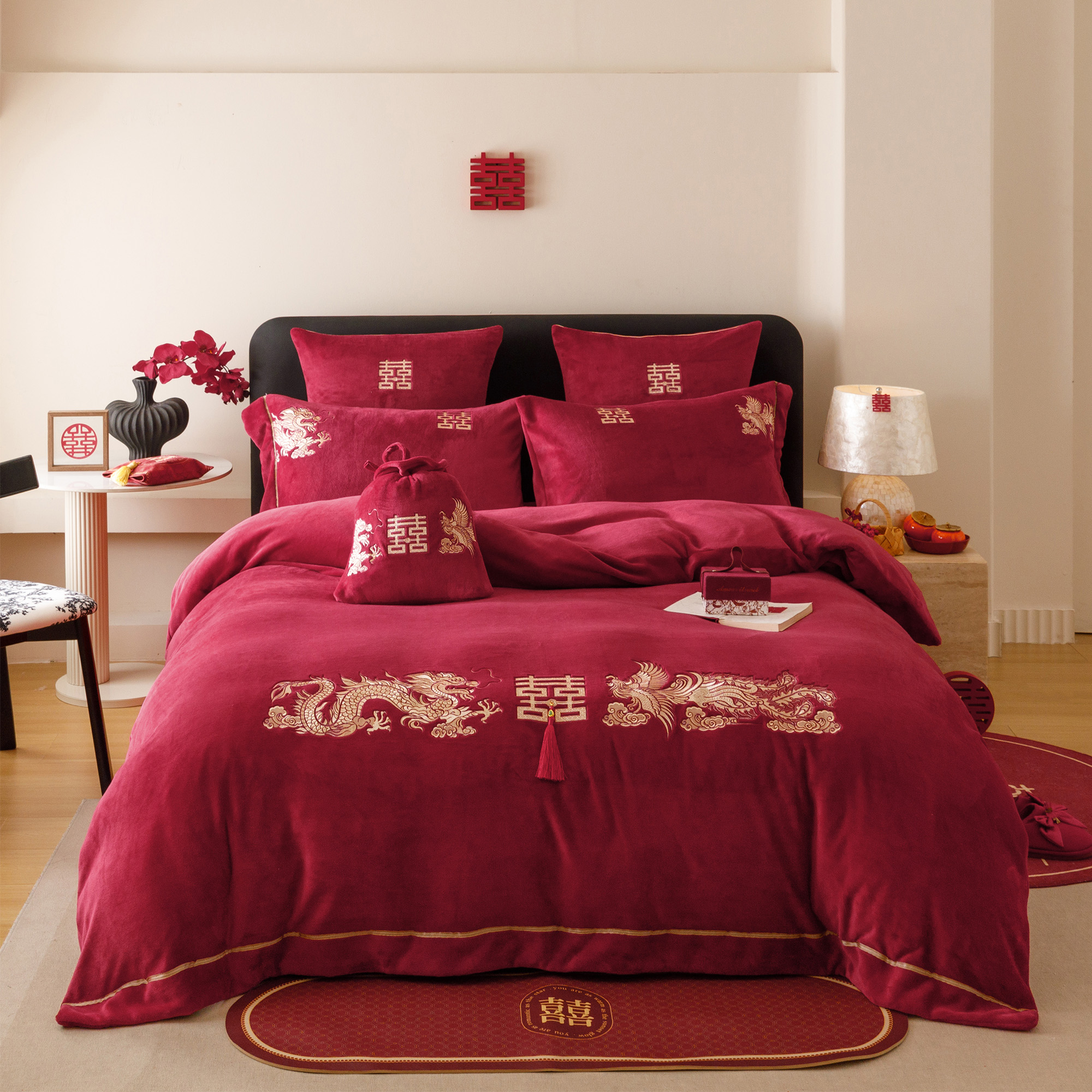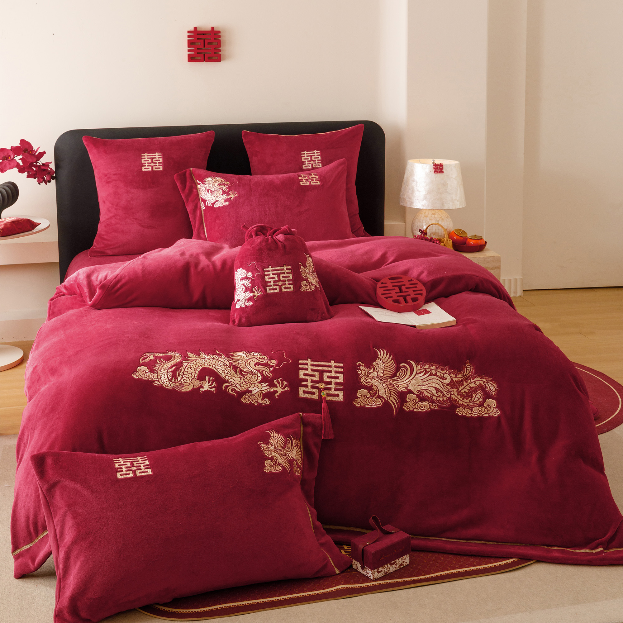 中式龙凤呈祥冬季牛奶绒四件套传统刺绣红色结婚被套保暖床单床笠