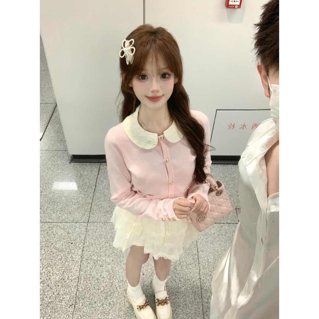 小香风新款娃娃领针织开衫上衣外套白色轻奢气质公主蓬蓬裙套装