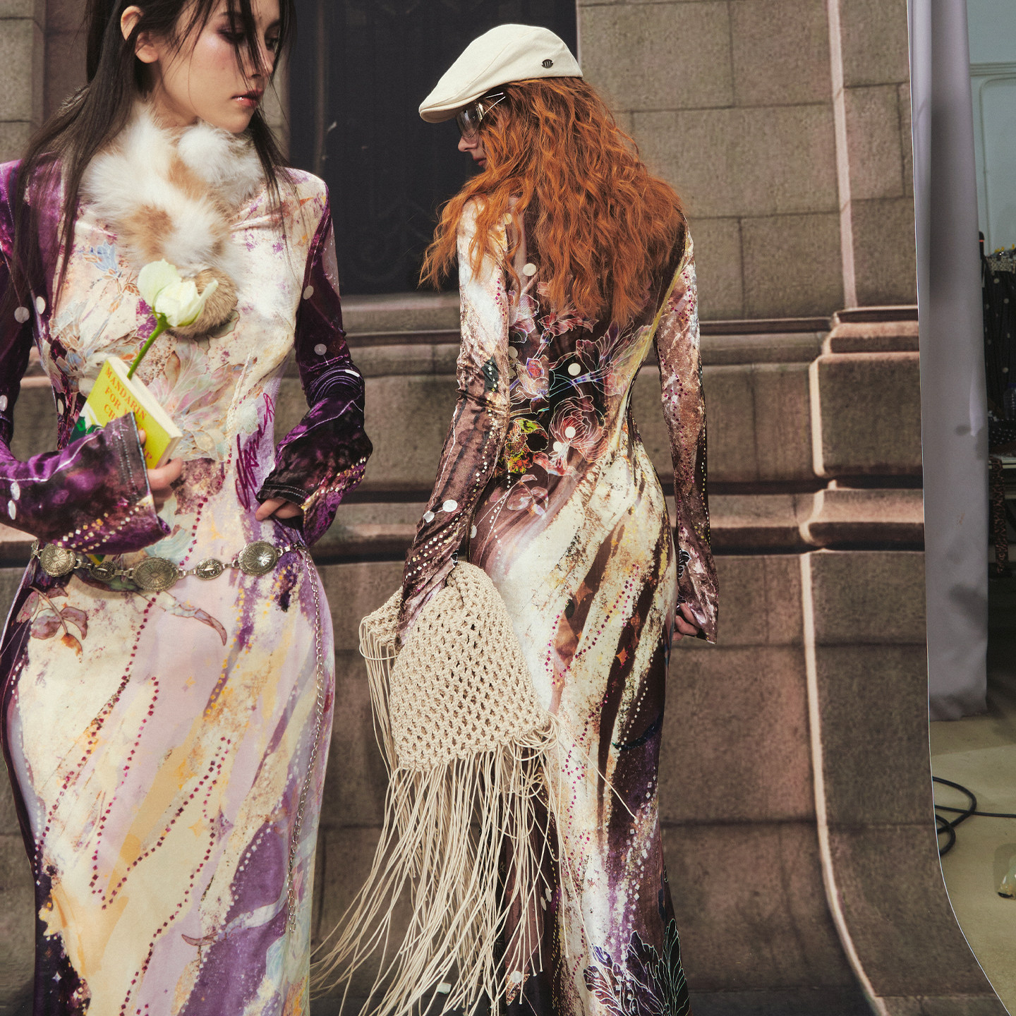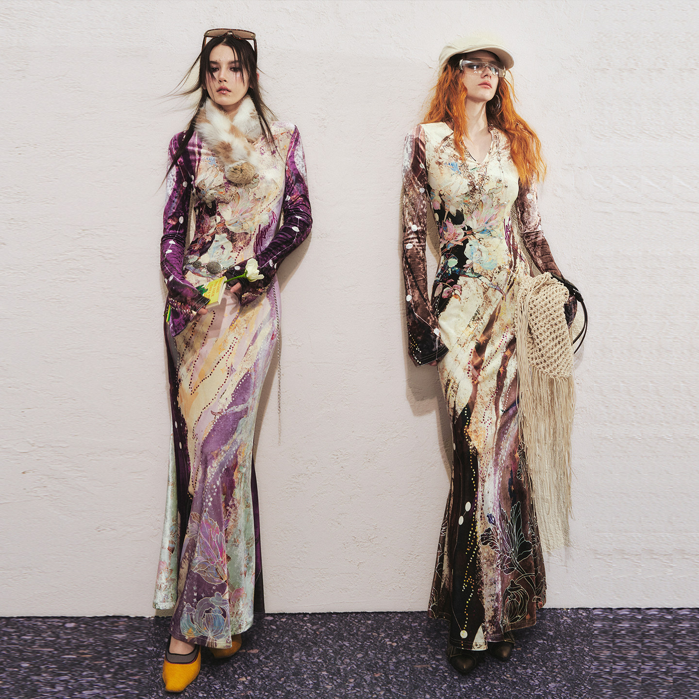 【现货】OfAkiva“朱雀山”原创花卉图案印花丝绒鱼尾连衣裙