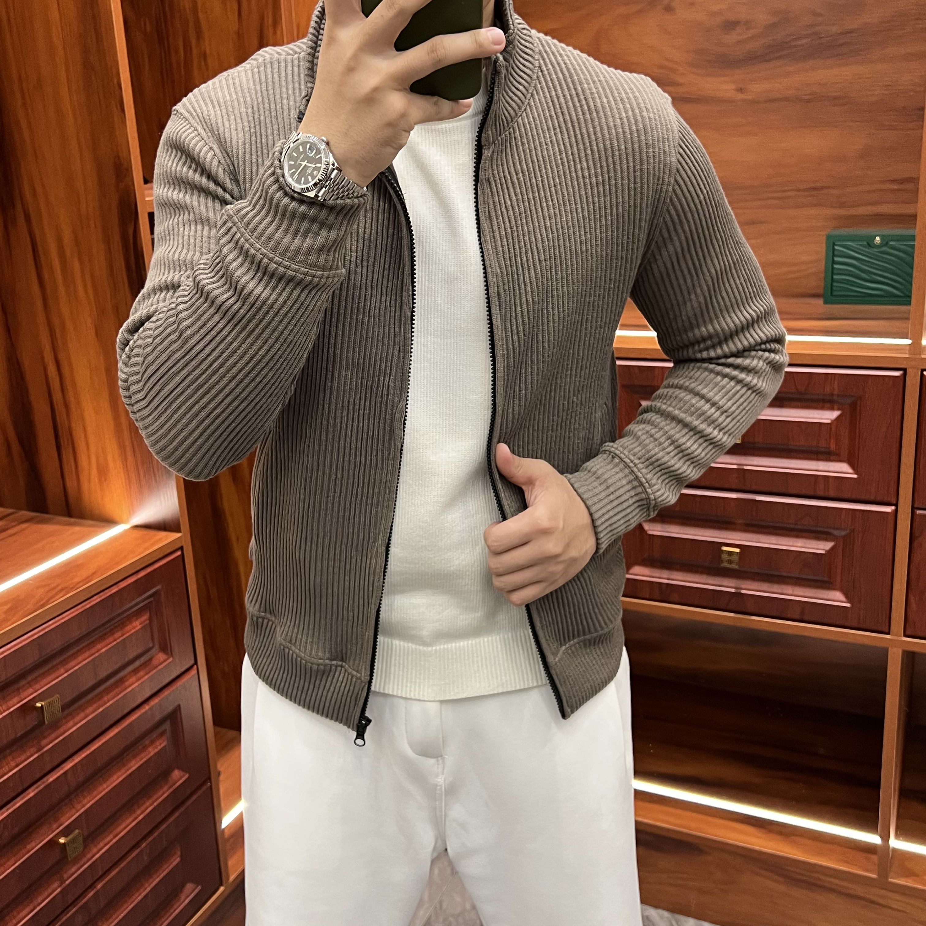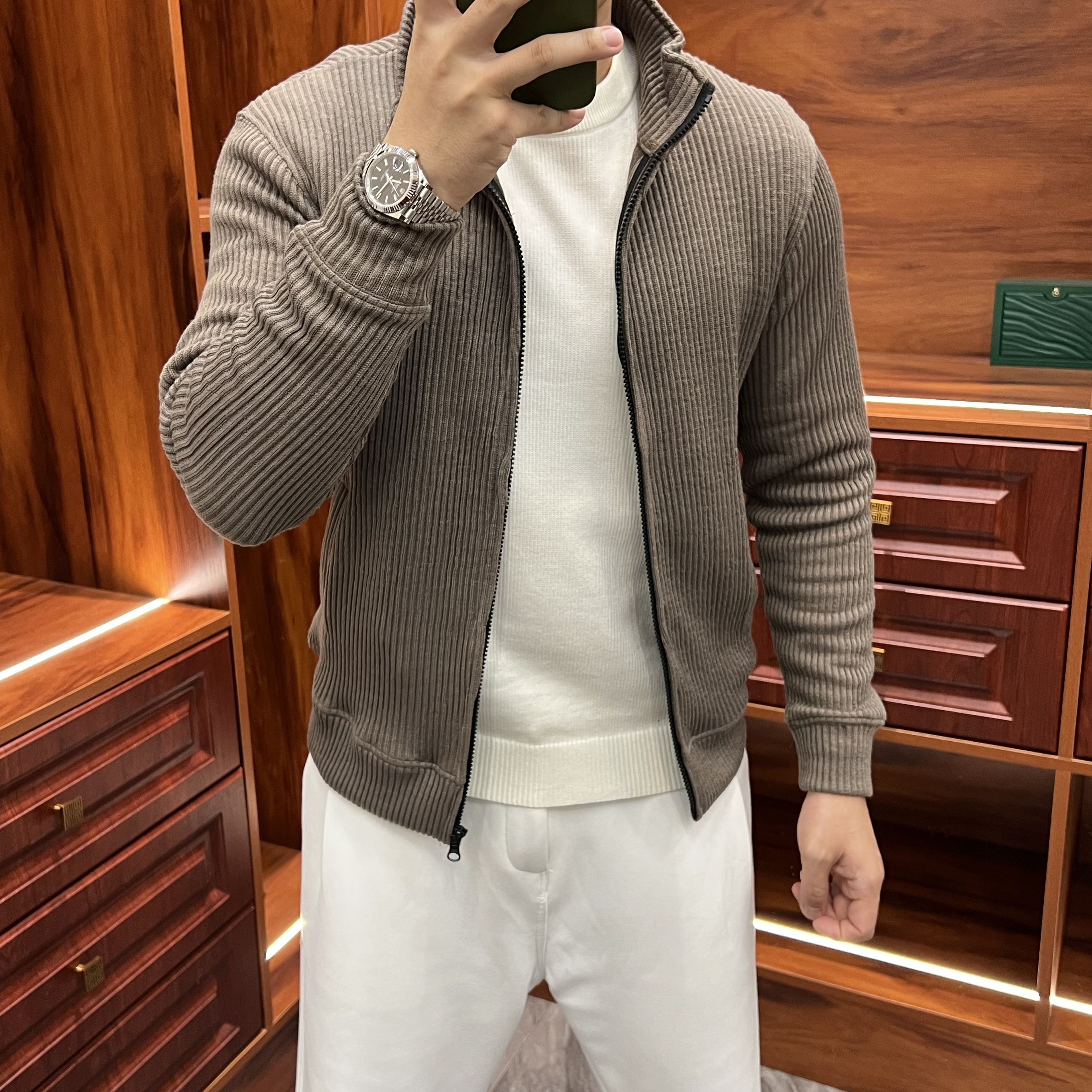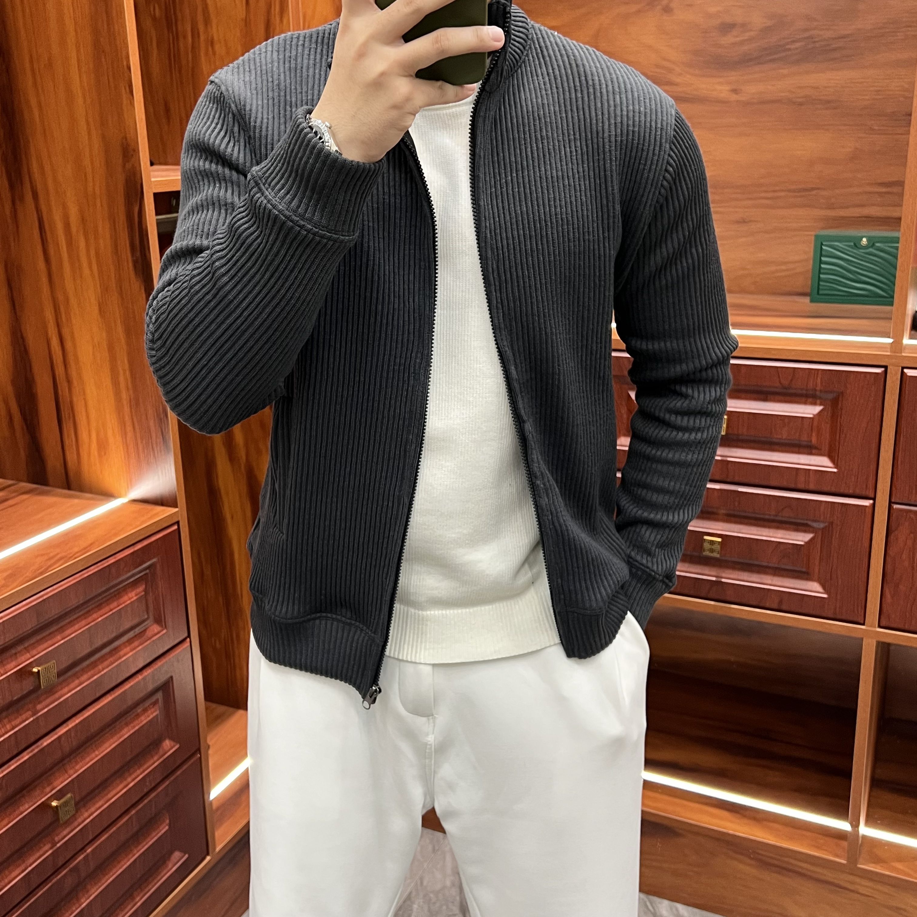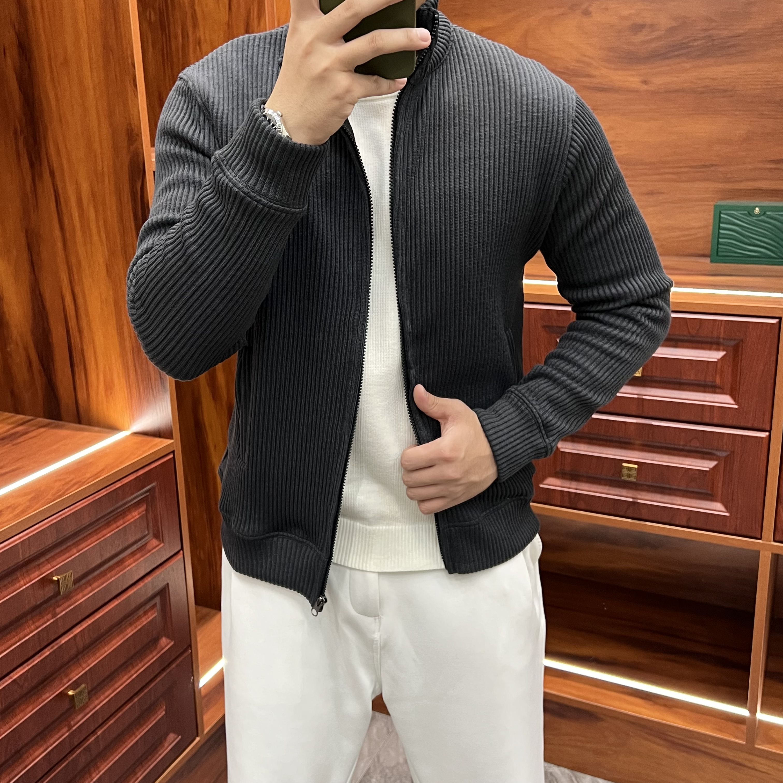 秋冬重磅立领复古坑条拉链半高领男士保暖毛衣百搭纯色帅气针织衫