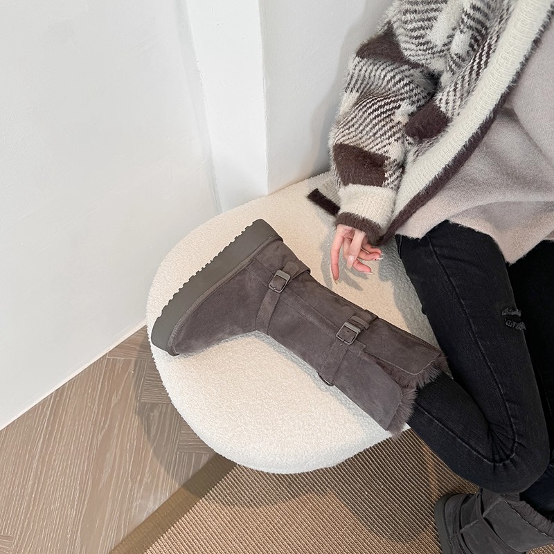 真皮~厚底灰色雪地靴女2025冬季新款加厚绒增高搭扣长筒雪地棉鞋