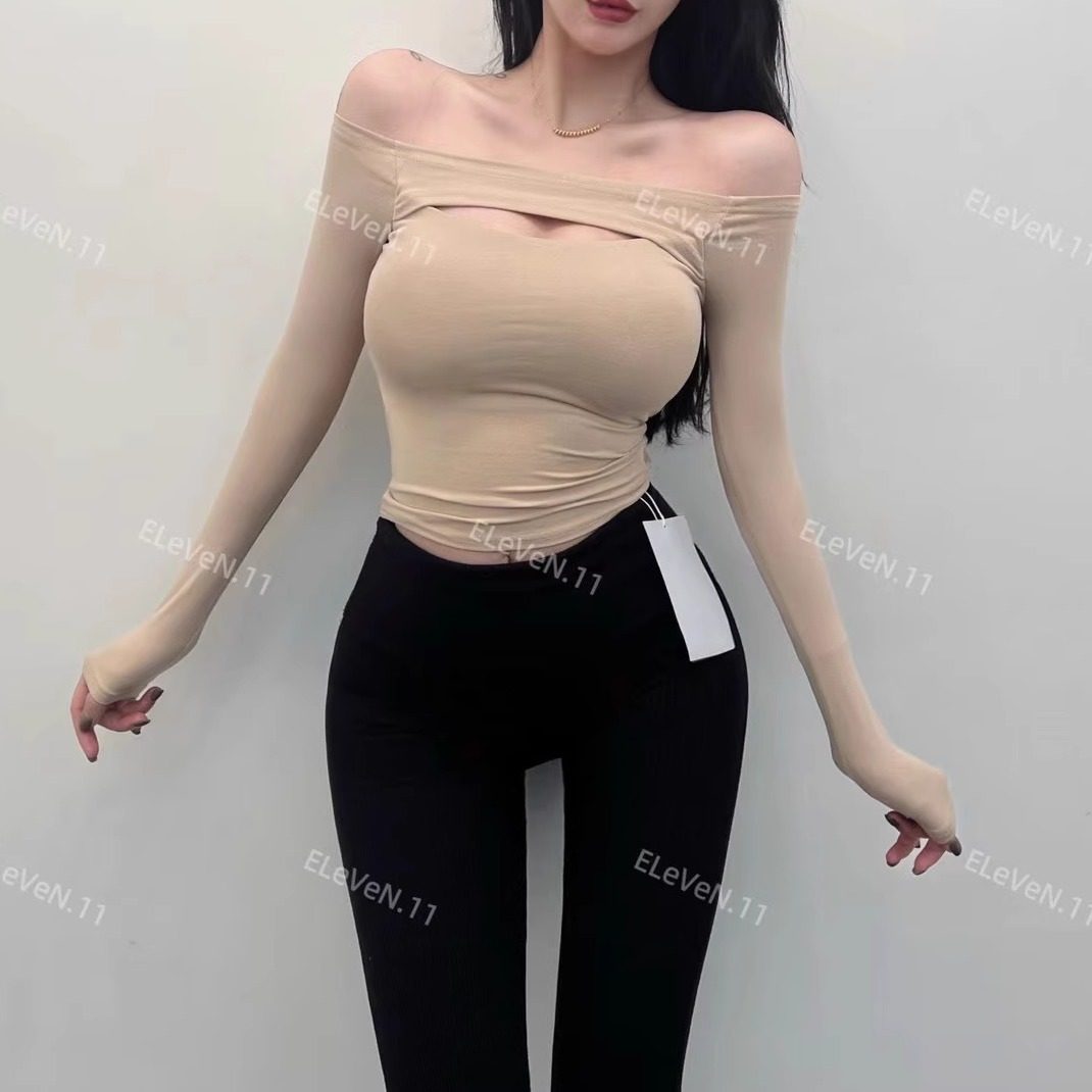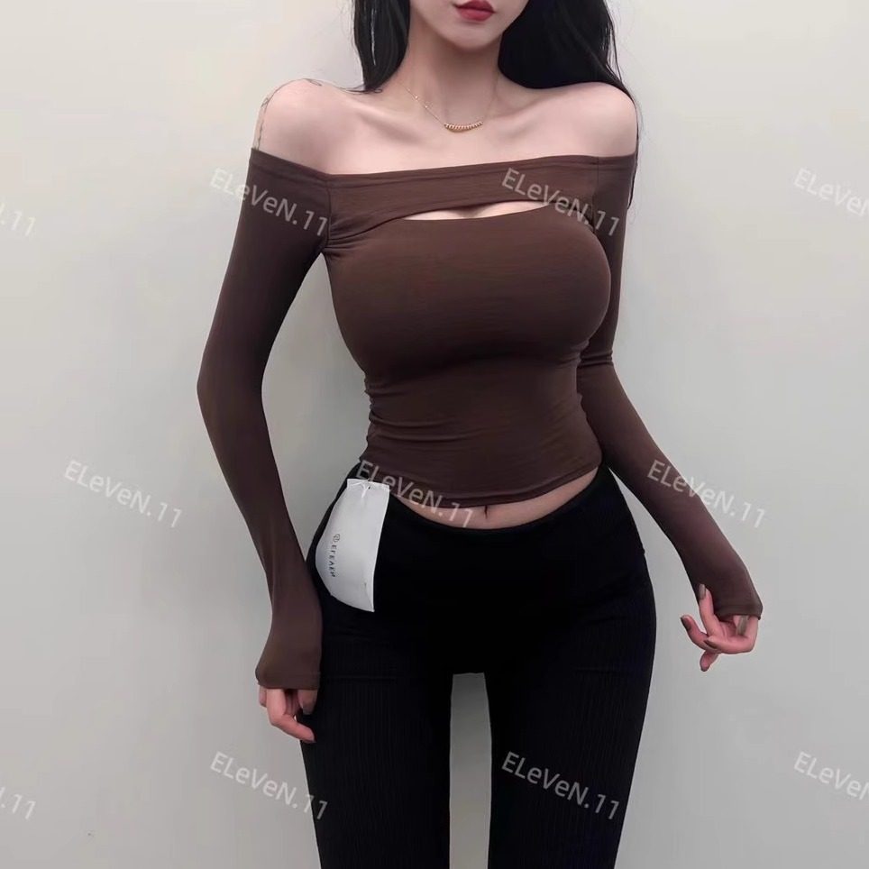 一字肩上衣胸垫长袖T恤修身打底