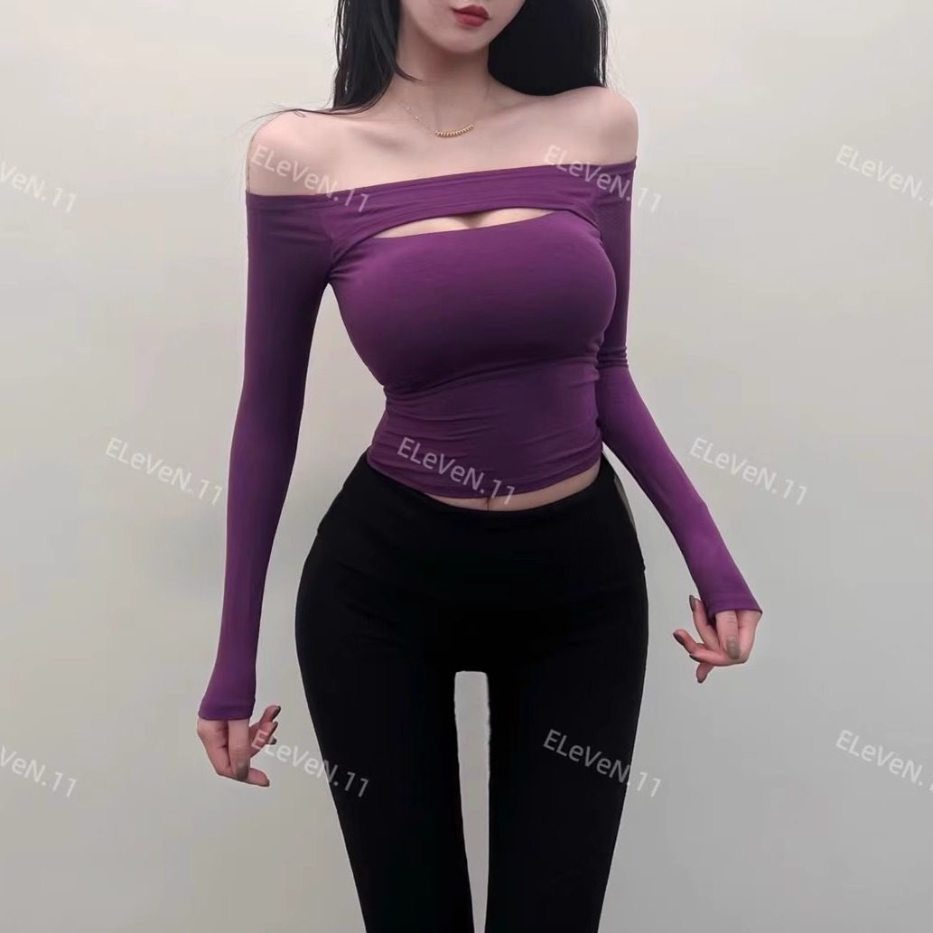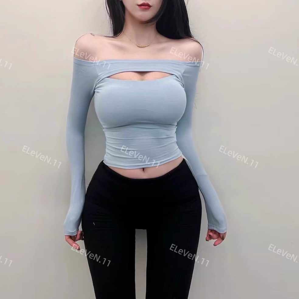 漫画胸!可拆卸胸垫一字领露肩长袖T恤女修身性感短款上衣打底衫