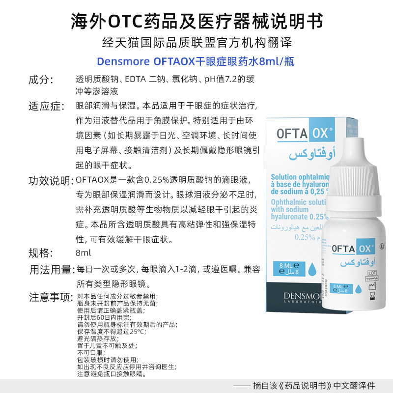 Densmore眼药水玻璃酸钠滴眼液缓解眼干眼涩人工泪液润干眼症专用
