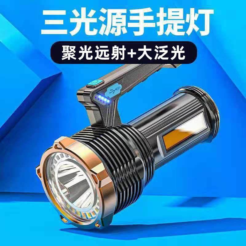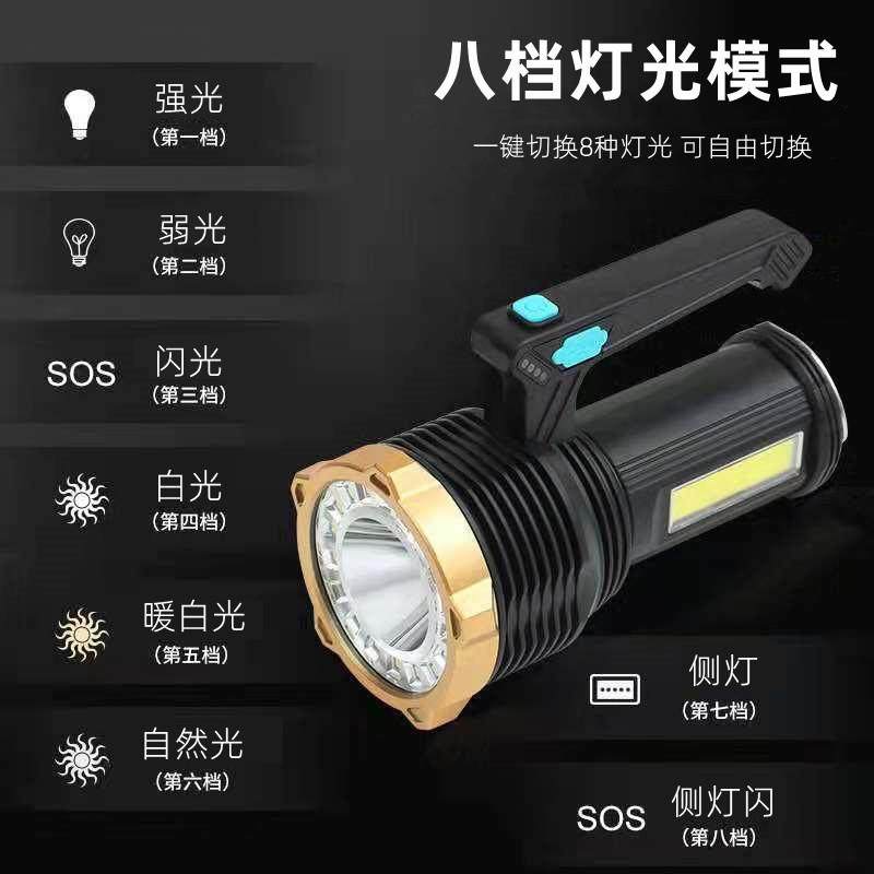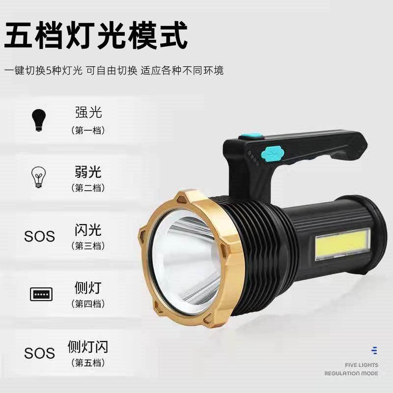 LED强光手电筒USB充电户外远射探照灯带侧灯工作灯duo黄光手提灯