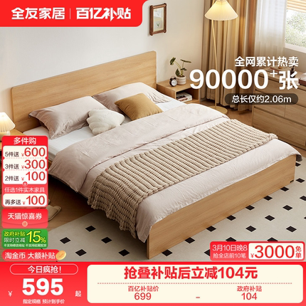 全友家居现代简约主卧室大床1米8双人床小户型家具原木风1.5米床