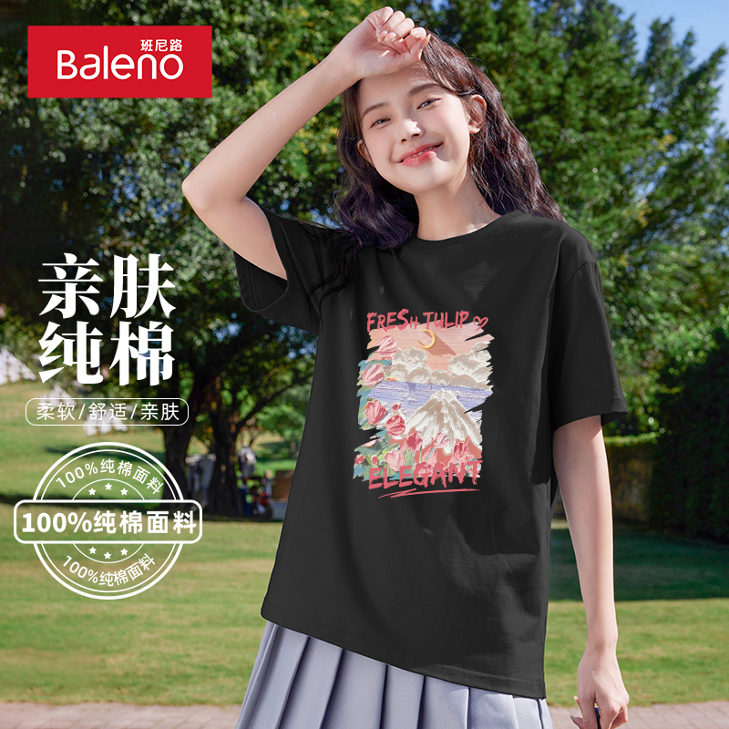 班尼路粉色短袖t恤女夏2025独特超好看上衣宽松减龄纯棉正肩半袖H