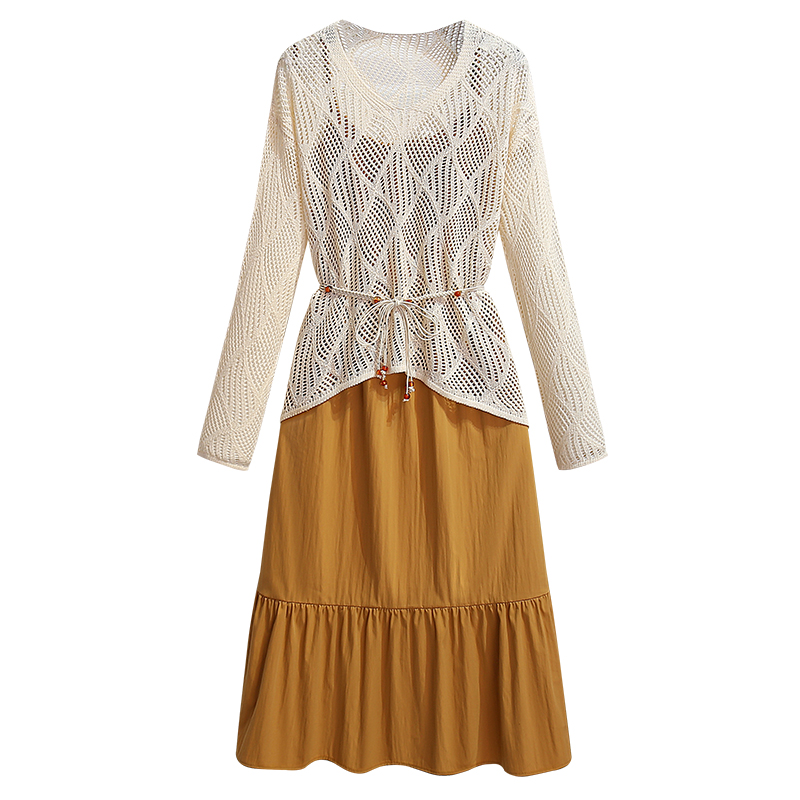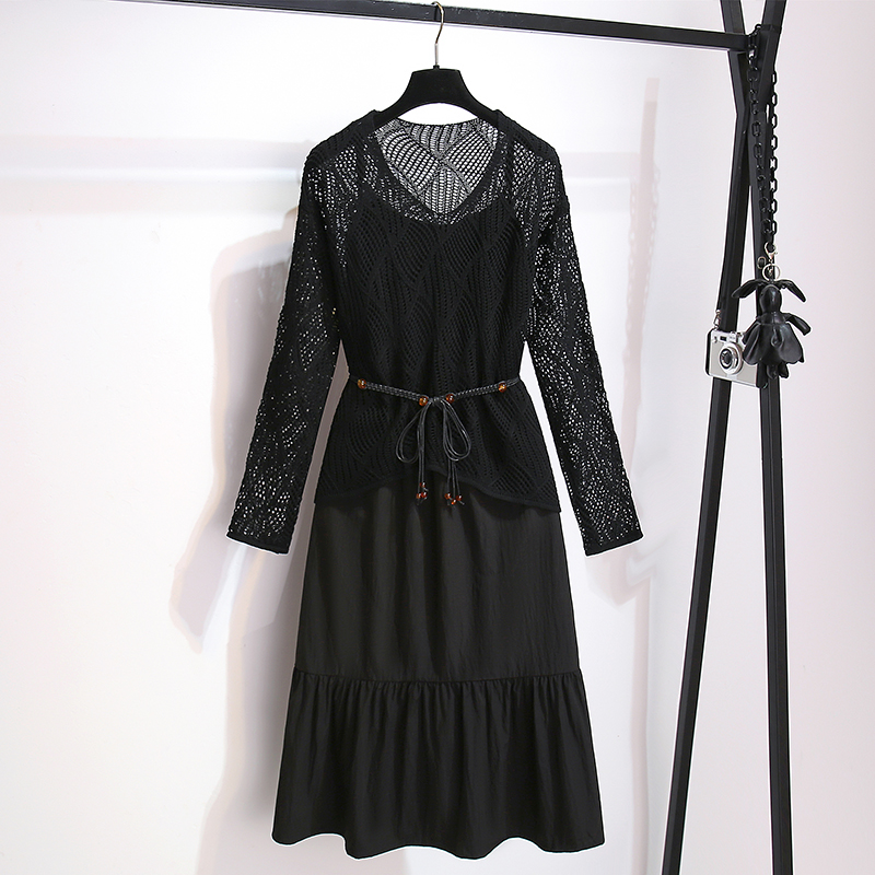 吊带连衣裙外搭针织镂空长袖罩衫女2025春秋新款收腰高级感两件套