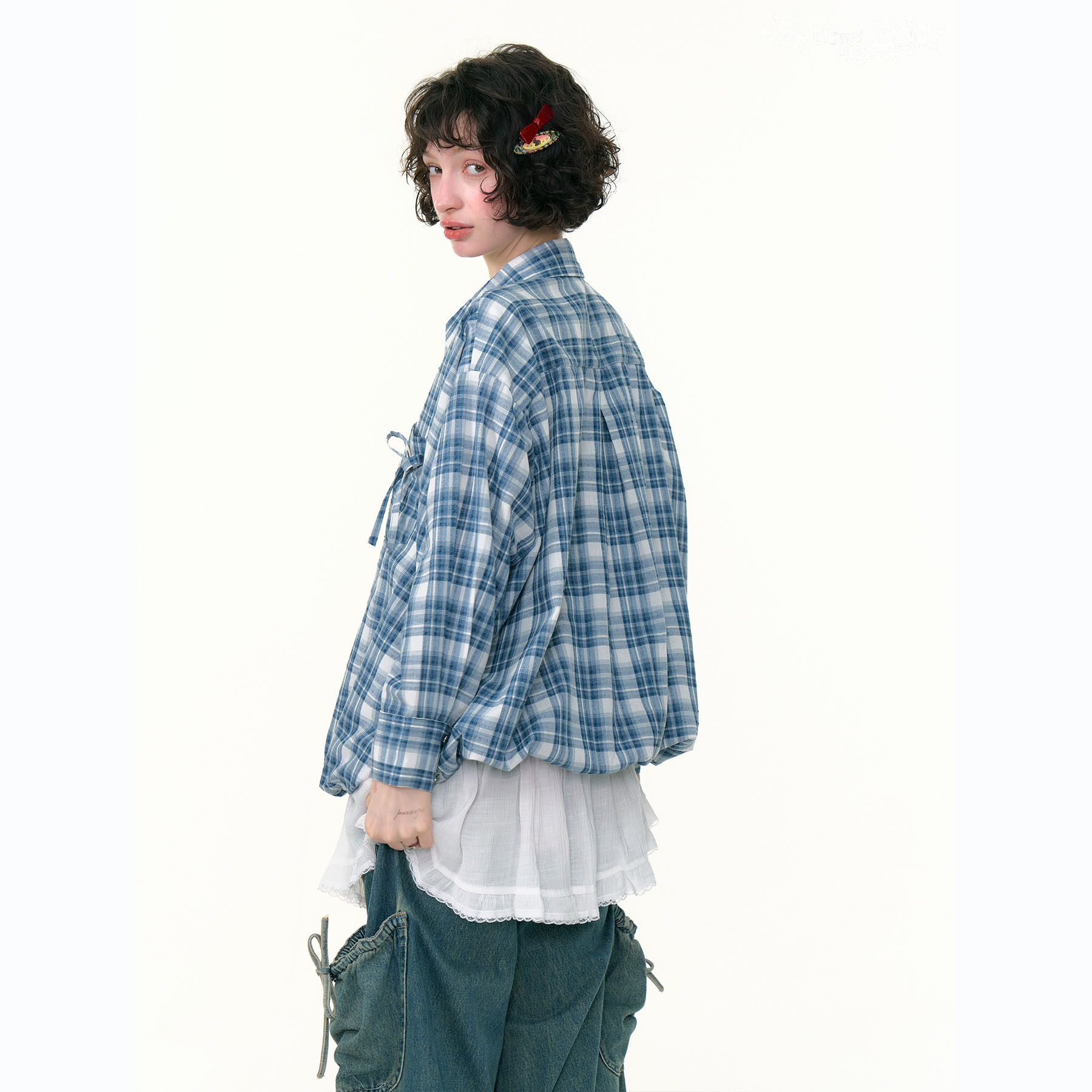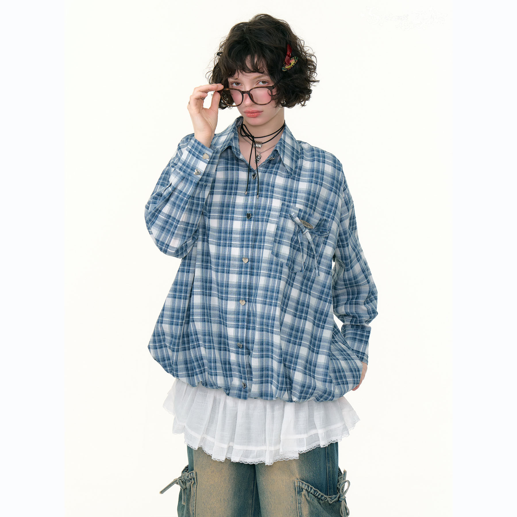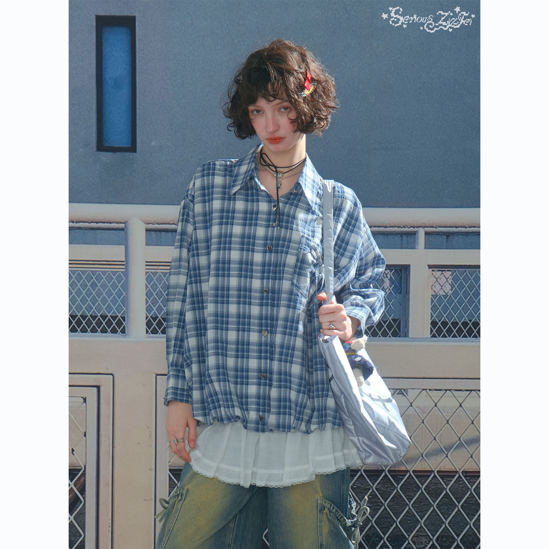 ziziFei秋冬新款美式复古设计感上衣蓝白格纹兜兜下摆长袖衬衫女