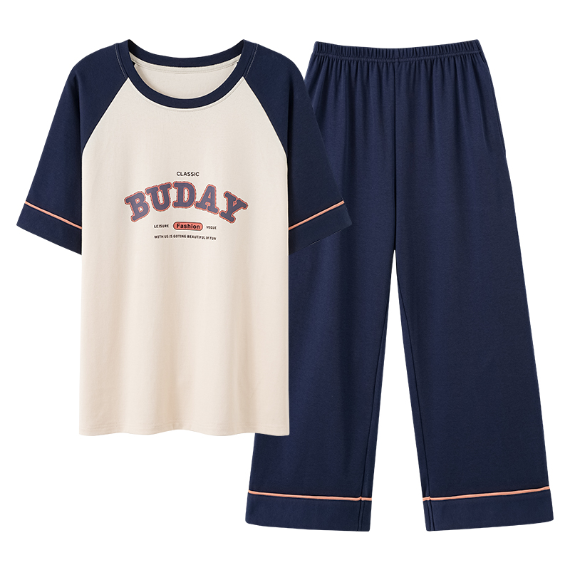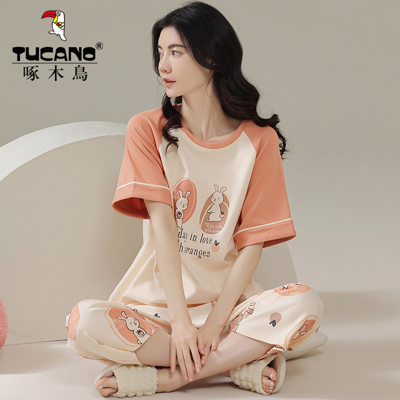 啄木鸟睡衣女夏天纯棉短袖七分裤网红风爆款可外穿夏季家居服套装