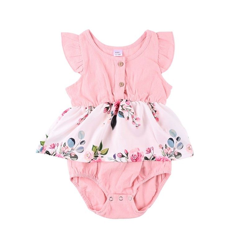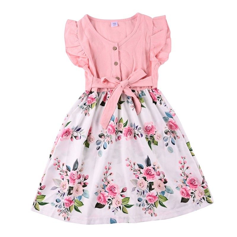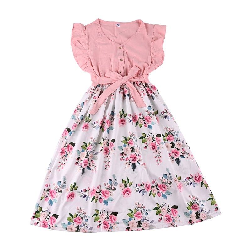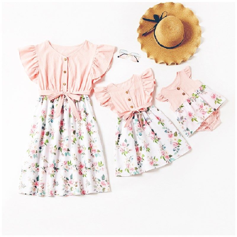 2021夏花卉亲子装小女童荷叶边飞袖母女玫瑰连衣裙女宝花朵哈衣裙