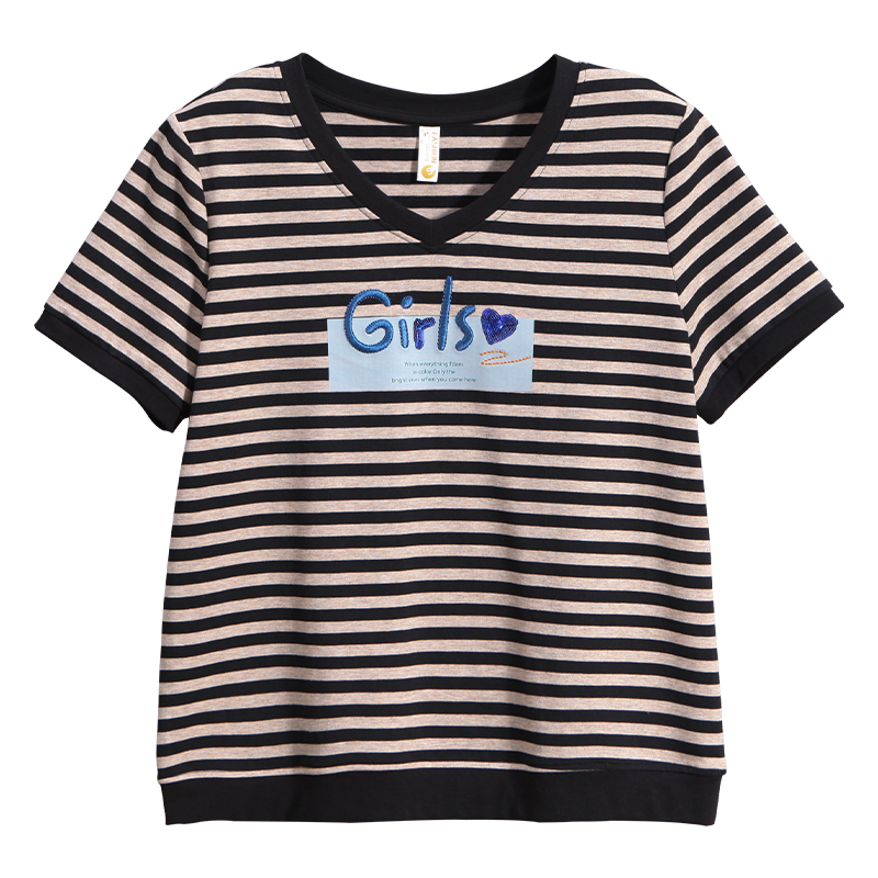 狐族条纹短袖T恤夏季薄款V领显瘦