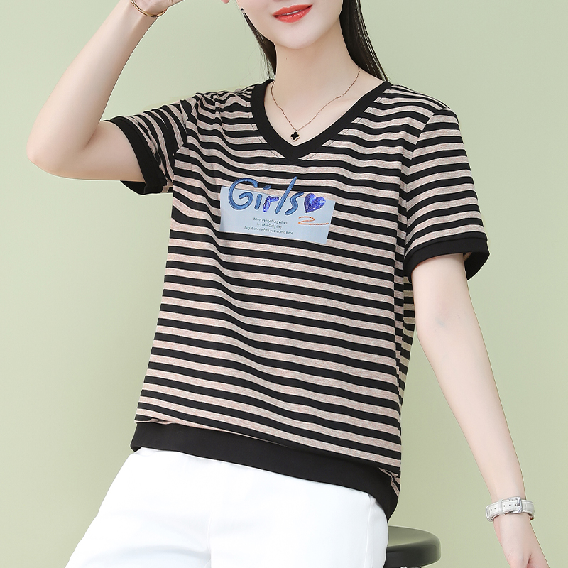 条纹v领短袖t恤女夏季2025新款爆款中年妈妈洋气百搭棉质体恤上衣