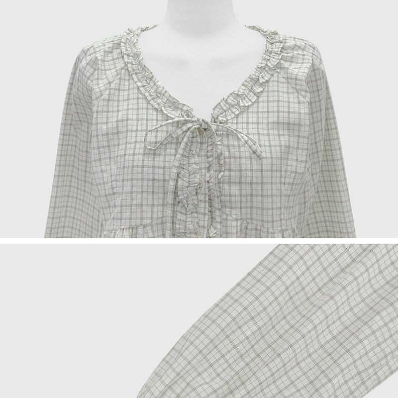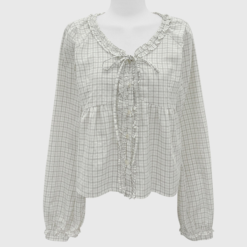 26春夏东大门时尚法式花边木耳V领系带插肩袖棉料格子女衬衫短款