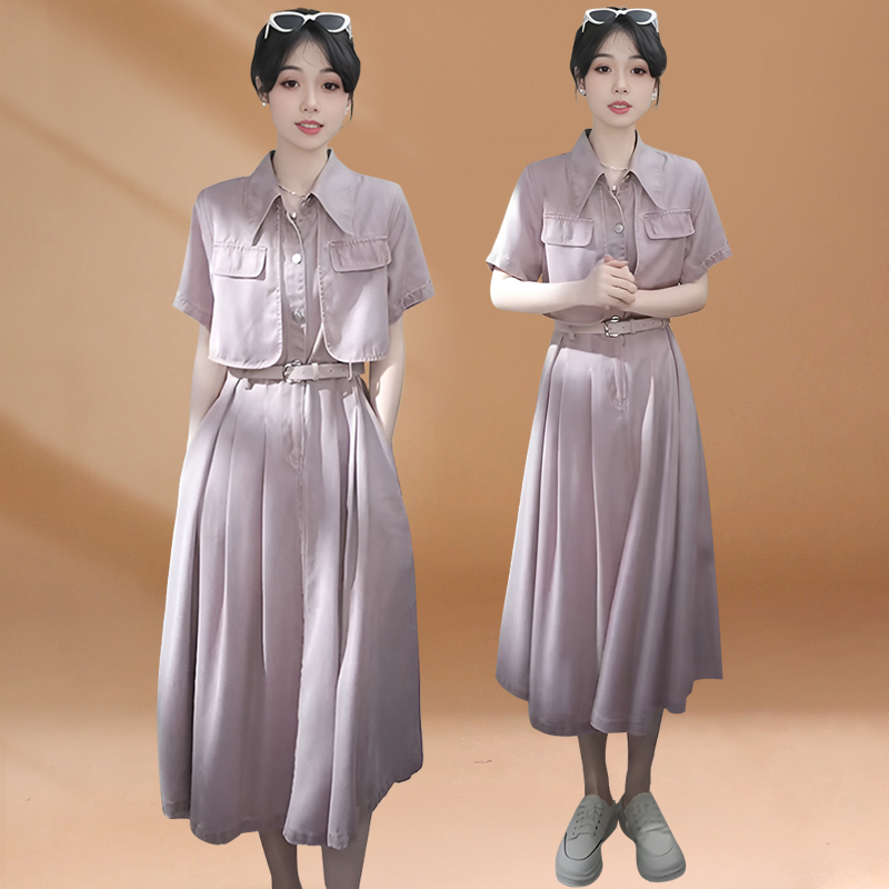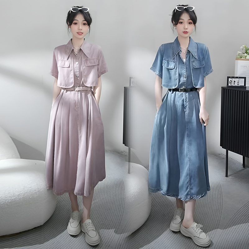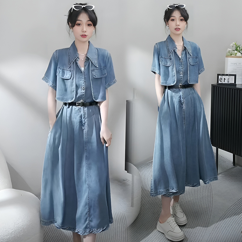 设计感假两件拼接POLO领牛仔连衣裙女2025夏季复古收腰显瘦长裙子