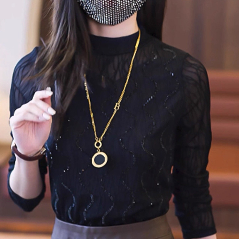 白色半高领蕾丝打底衫女秋冬修身内搭网纱t恤洋气百搭长袖上衣