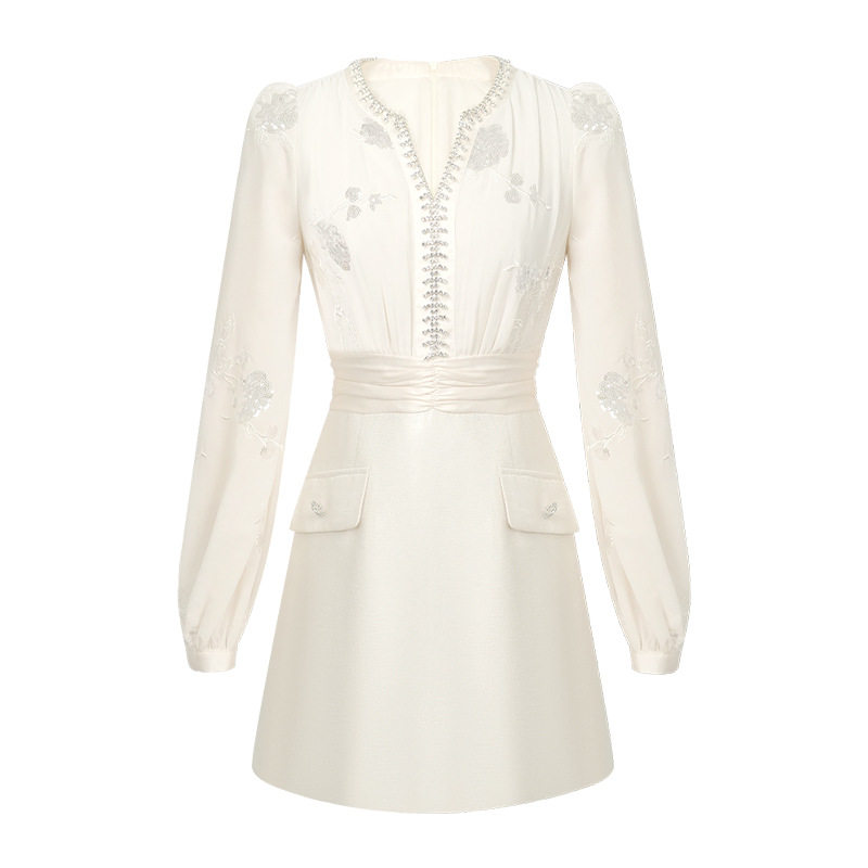 2025秋冬装新款女装法式千金重工镶钻V领拼接修身显高连衣裙51115