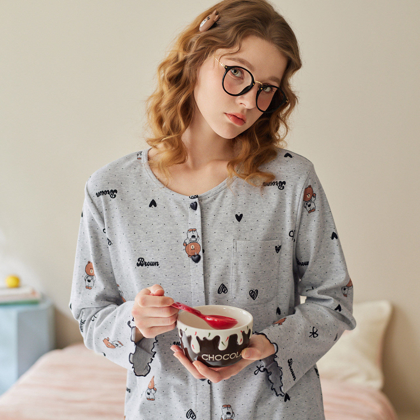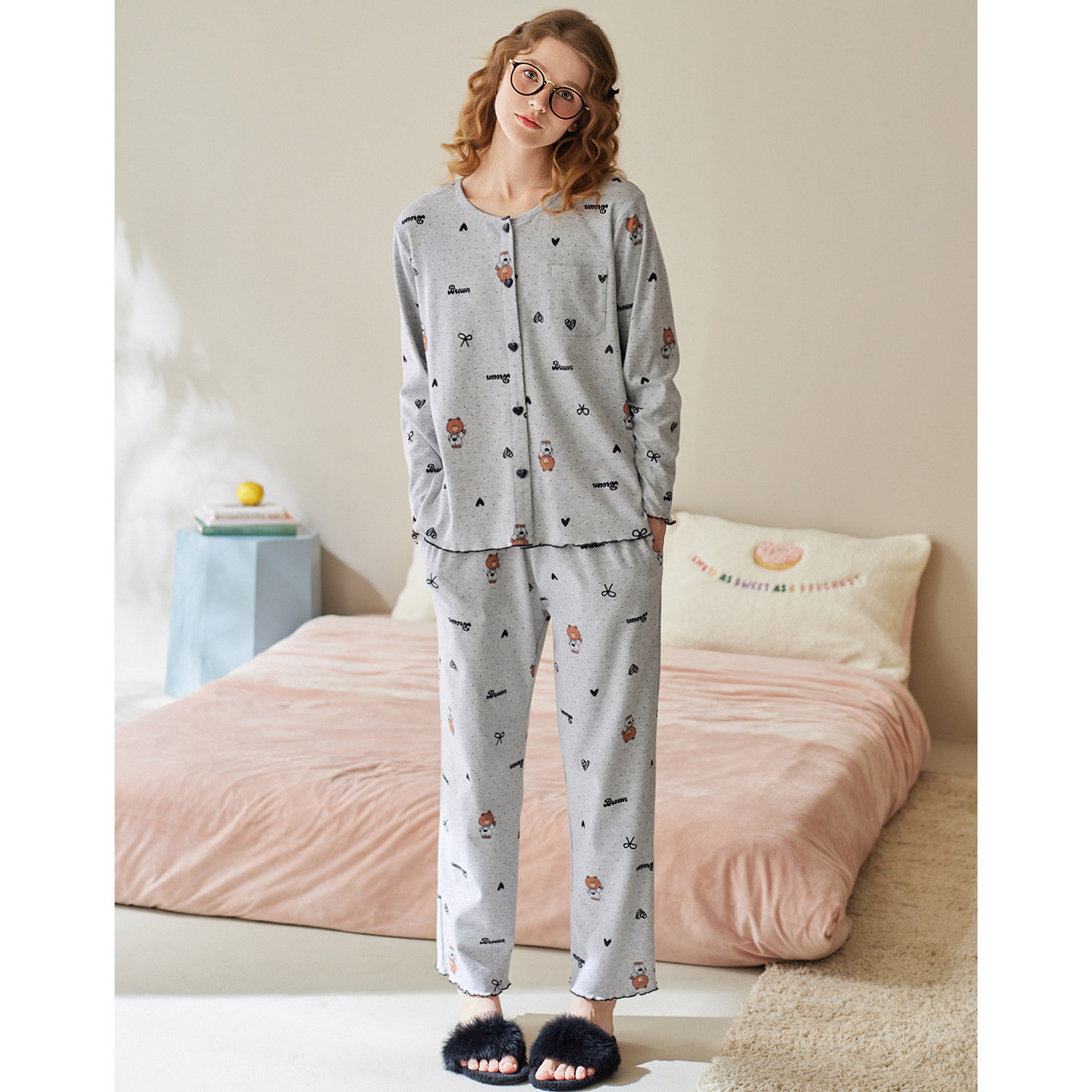 芬腾睡衣女春秋季纯棉长袖套装抗静电卡通可爱布朗熊家居服套装秋
