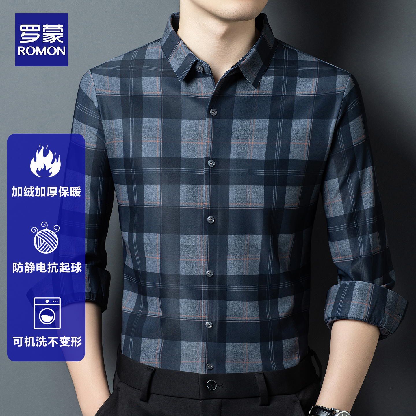 罗蒙2025冬季新款加绒加厚男士长袖衬衫抗皱免烫商务格子保暖衬衣