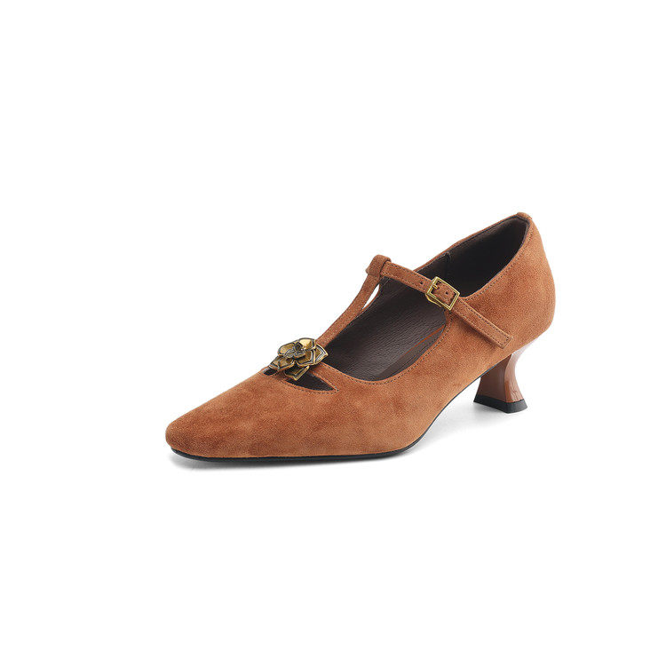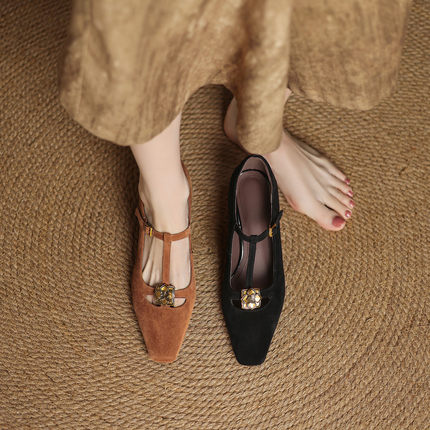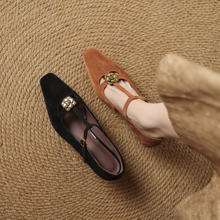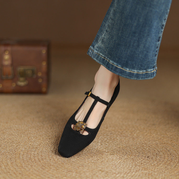 巨好看~气质手工真皮羊翻皮单鞋女方头T带丁字鞋花朵中跟细跟百搭