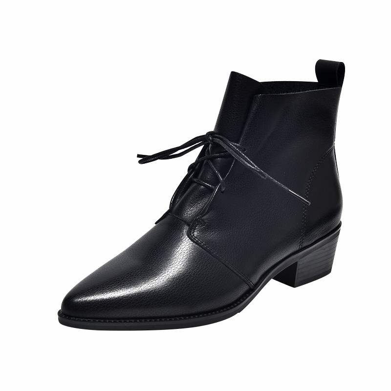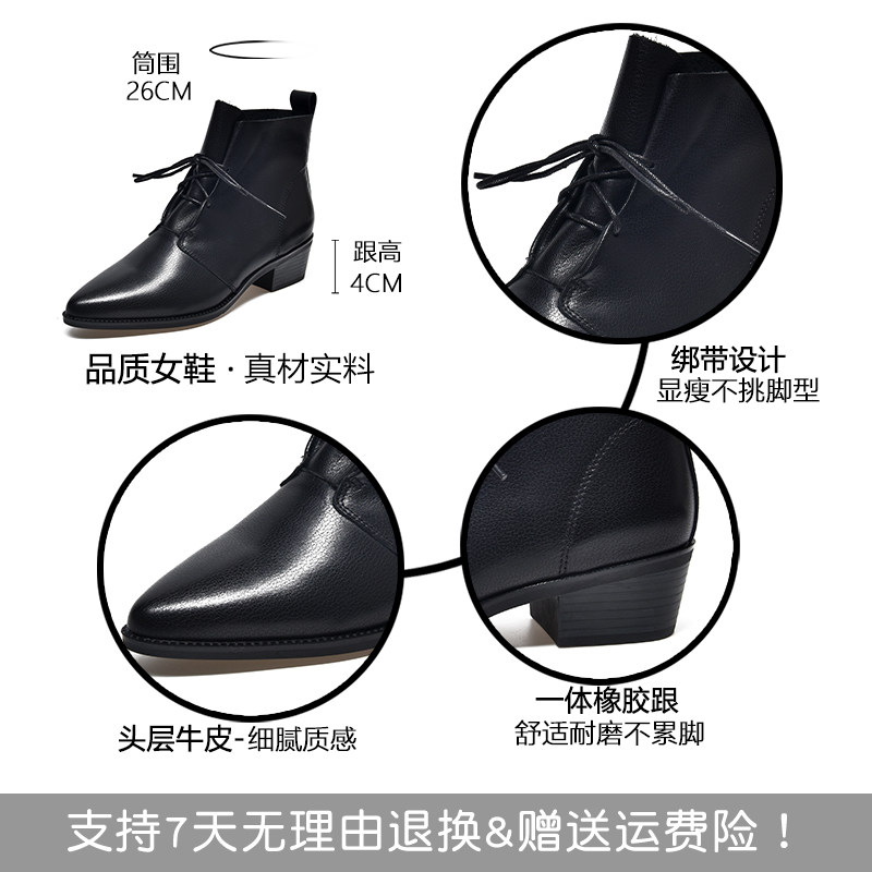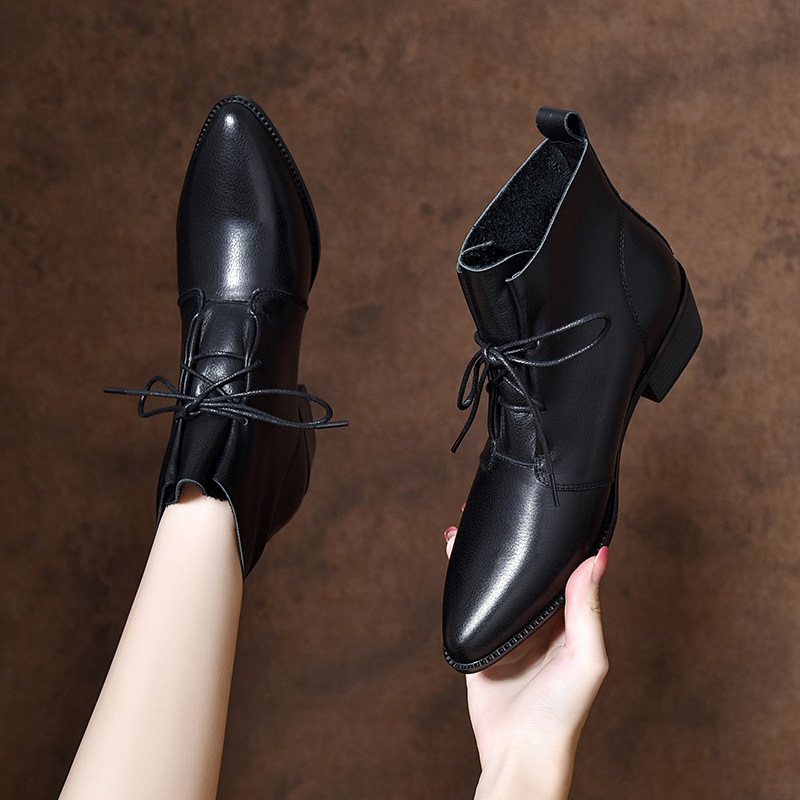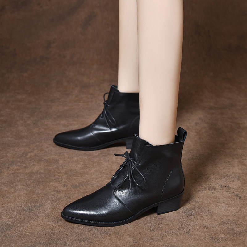 2025新款女鞋软皮尖头系带粗跟短靴春秋单靴妈妈中跟真皮鞋马丁靴