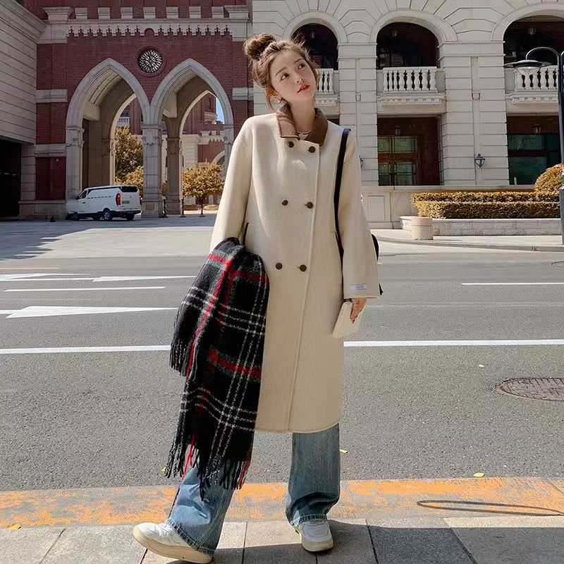 韩系米色大衣女中长款2024秋冬新款小众设计感撞色慵懒风毛呢外套