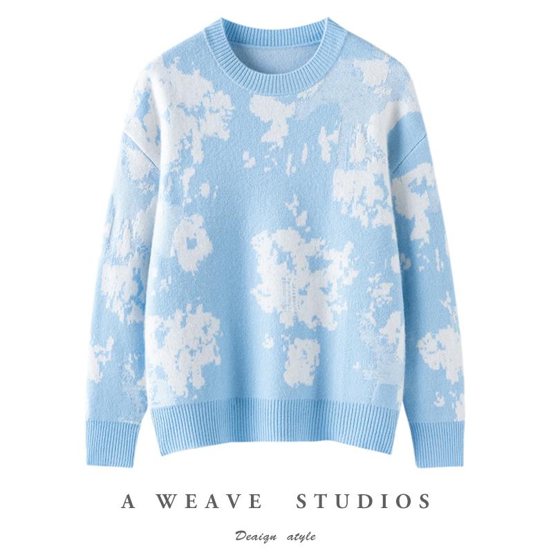 设计牛货!2025秋冬圆领100%纯羊毛衫女宽松毛衣印花针织羊绒上衣