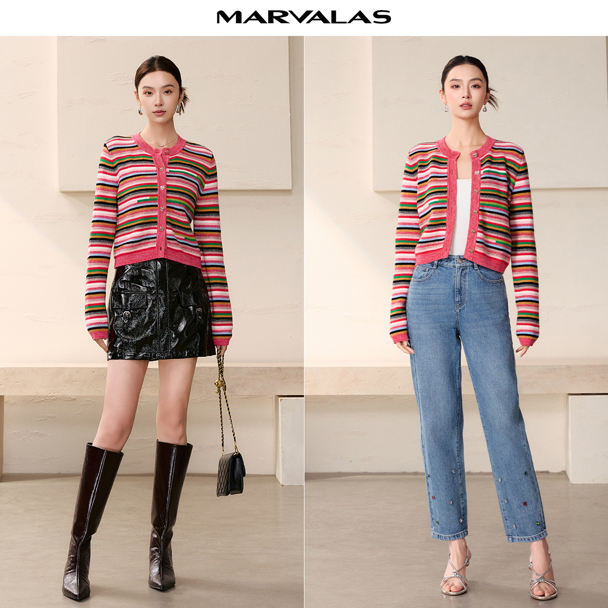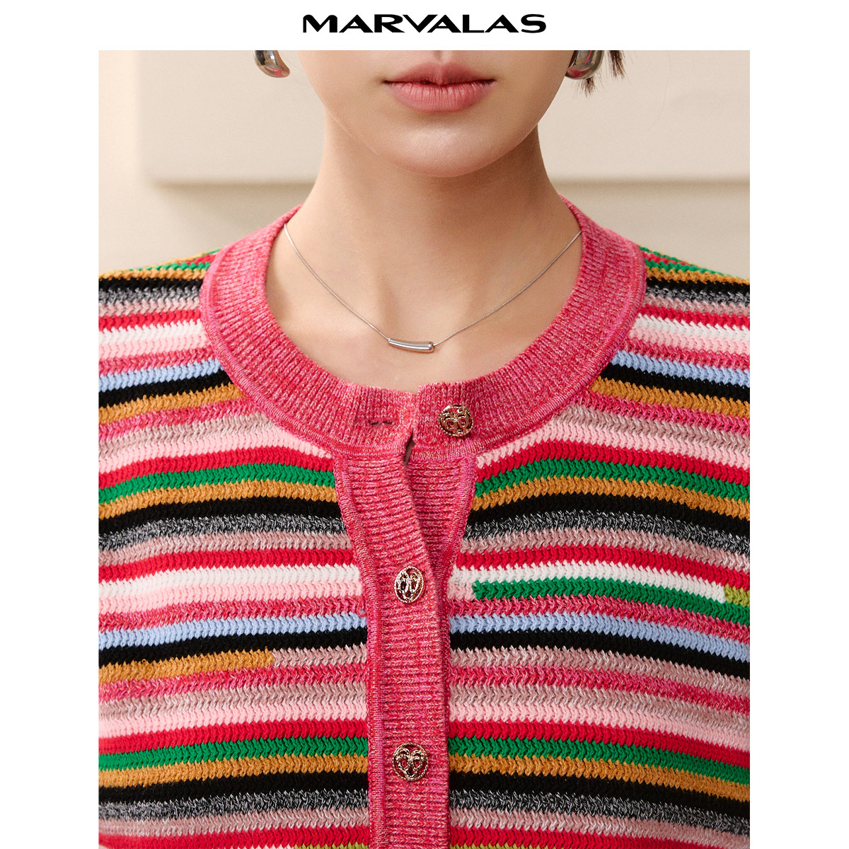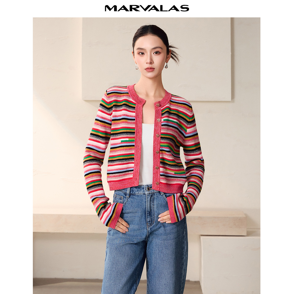 曼德诗设计感开衫2025秋季新款不规则短款彩虹条纹撞色工艺针织衫