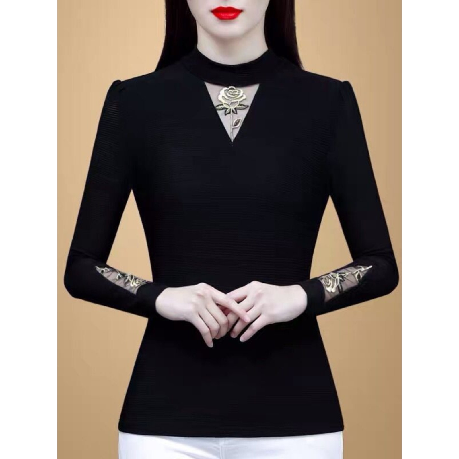 黑色长袖t恤百搭2025漂亮外穿半高领网纱打底衫保暖秋冬加绒加厚