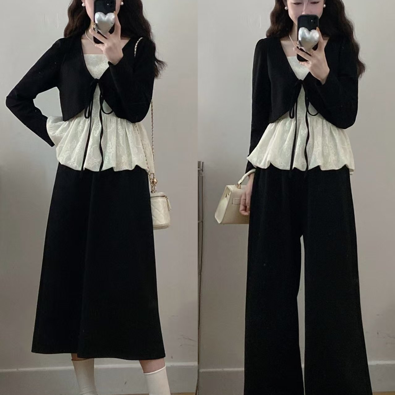 2025新款大码宽松显瘦休闲蕾丝长袖上衣搭配百搭阔腿长裤两件套