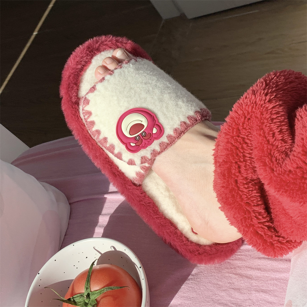 细细条 可爱草莓熊一字棉拖鞋秋冬季正版迪士尼居家平底地板鞋女