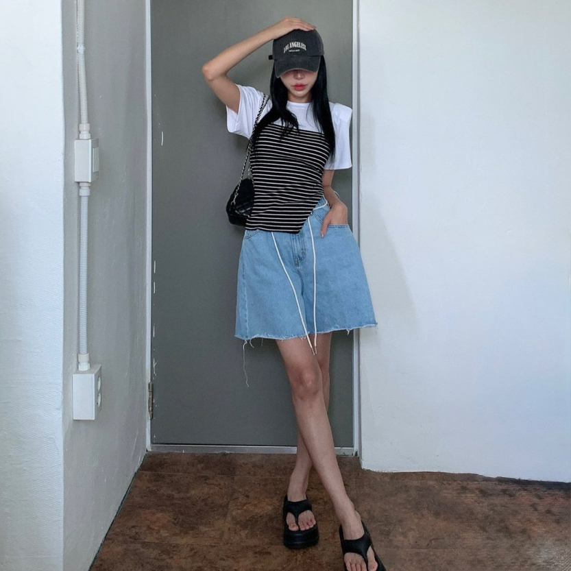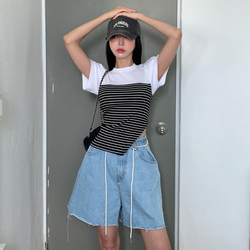 韩国条纹拼接假两件针织短袖T恤