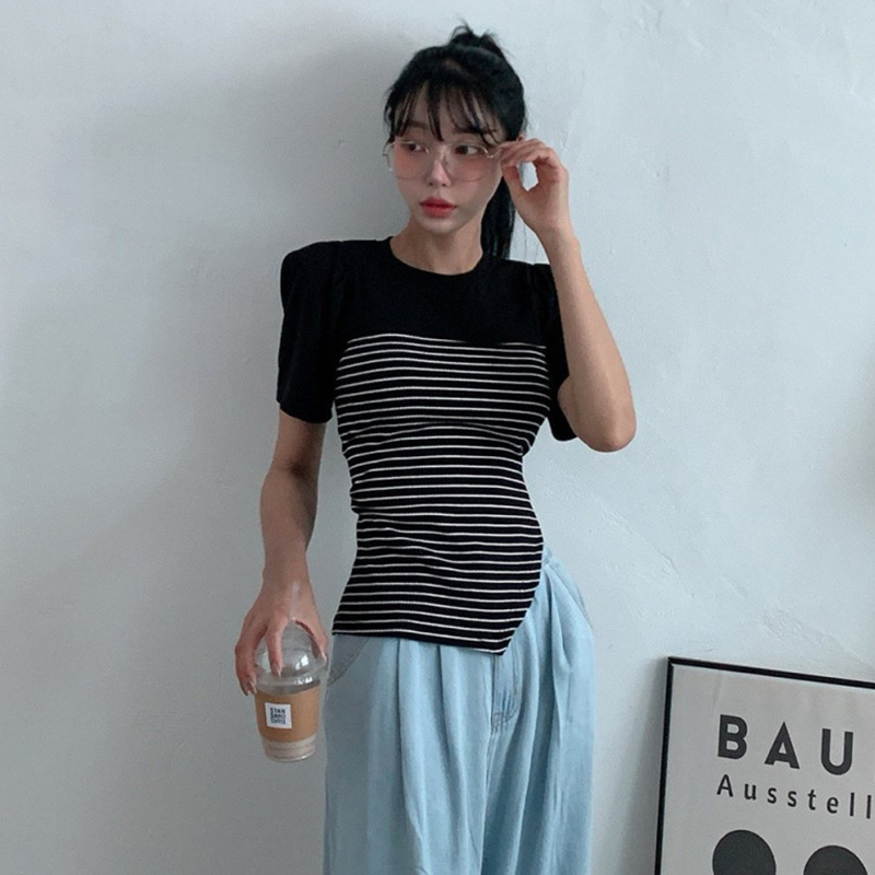 韩国东大门气质圆领修身条纹拼接假两件泡泡袖系带针织短袖T恤女