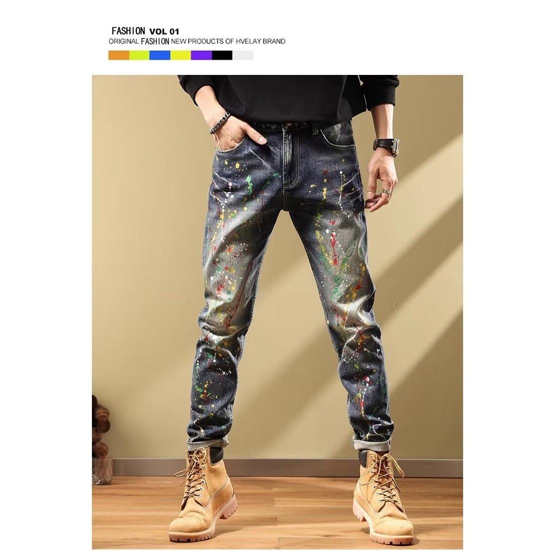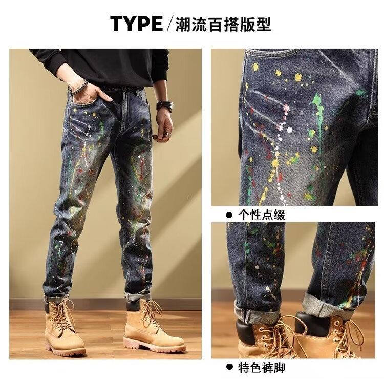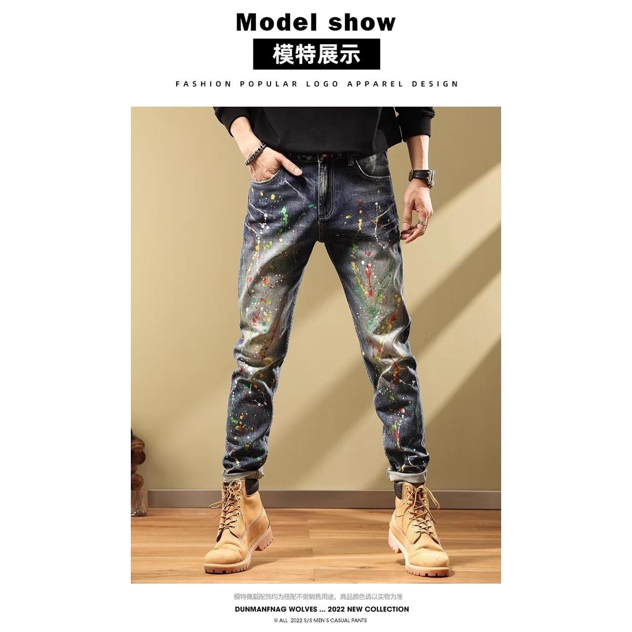 秋冬时尚百搭牛仔裤男潮牌欧美修身小脚弹力长裤子男复古泼墨油漆