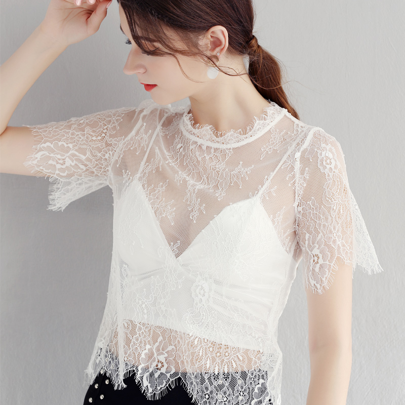 洋气蕾丝打底衫女短袖夏季薄款黑色内搭纱衣配裙子的镂空网纱上衣