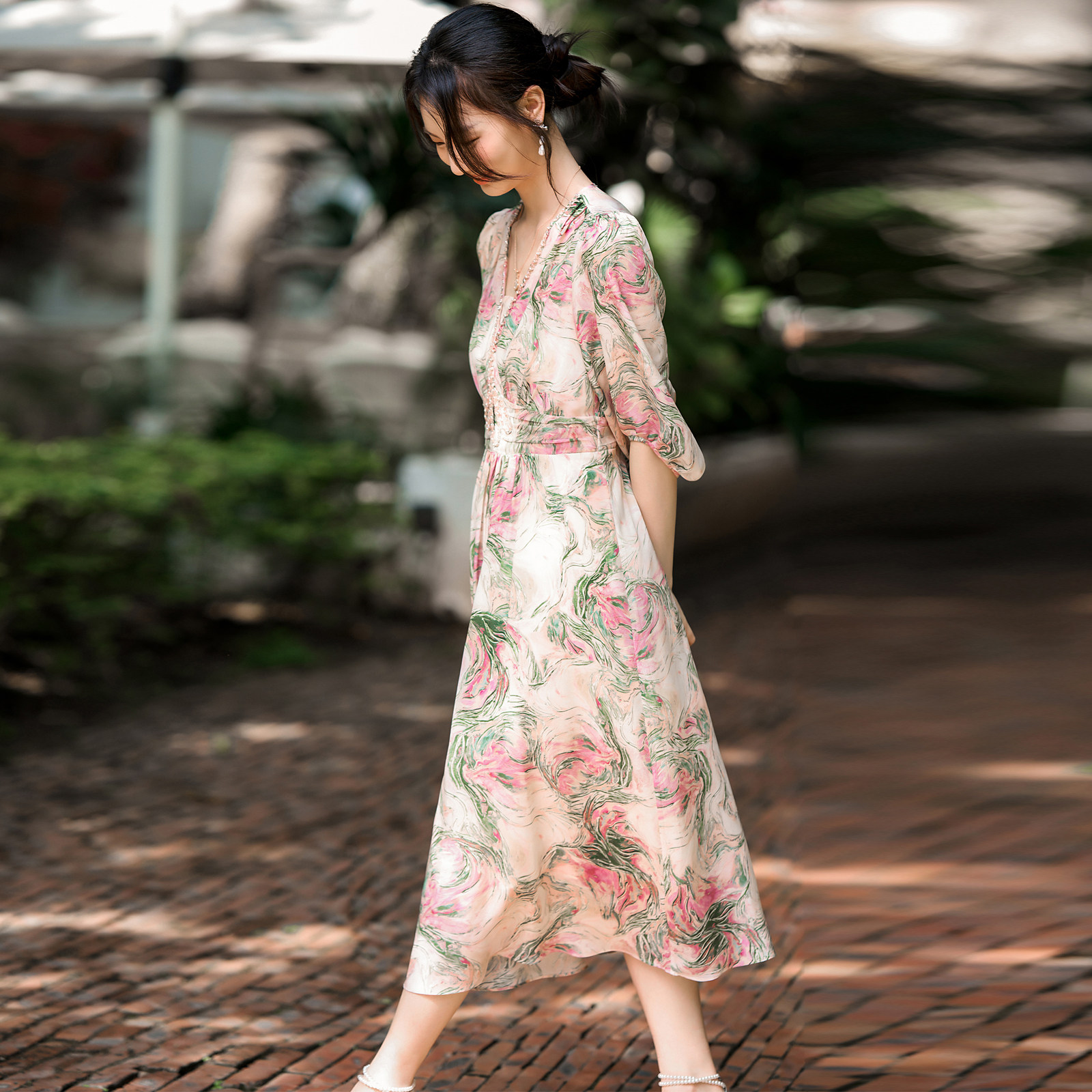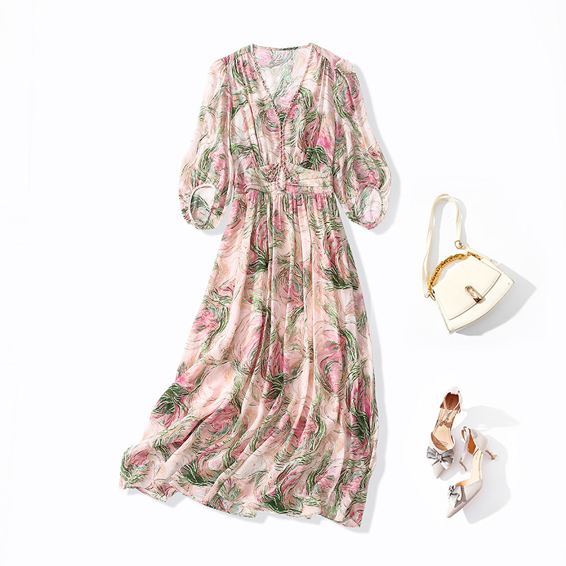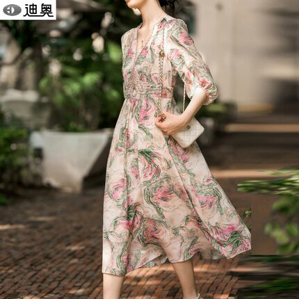 迪奥真丝印花连衣裙女2026夏季新款法式复古浪漫茶歇裙桑蚕丝裙子