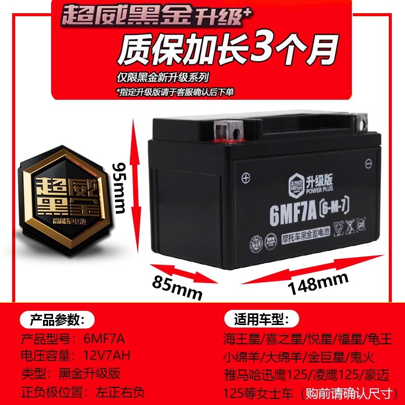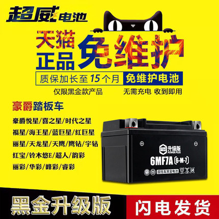 超威女装式踏板摩托车电瓶ytx7a-bs免维护12v7ah豪爵干蓄电池专用